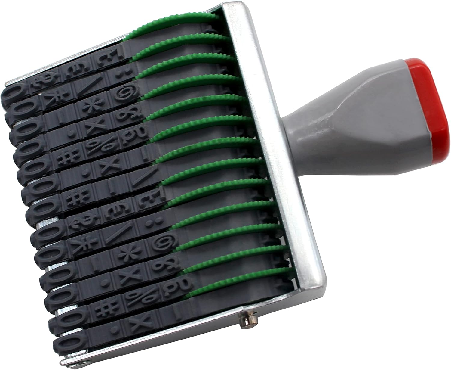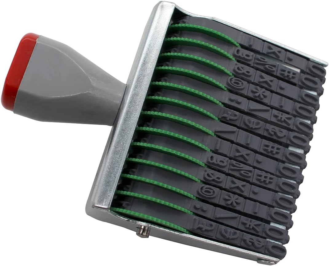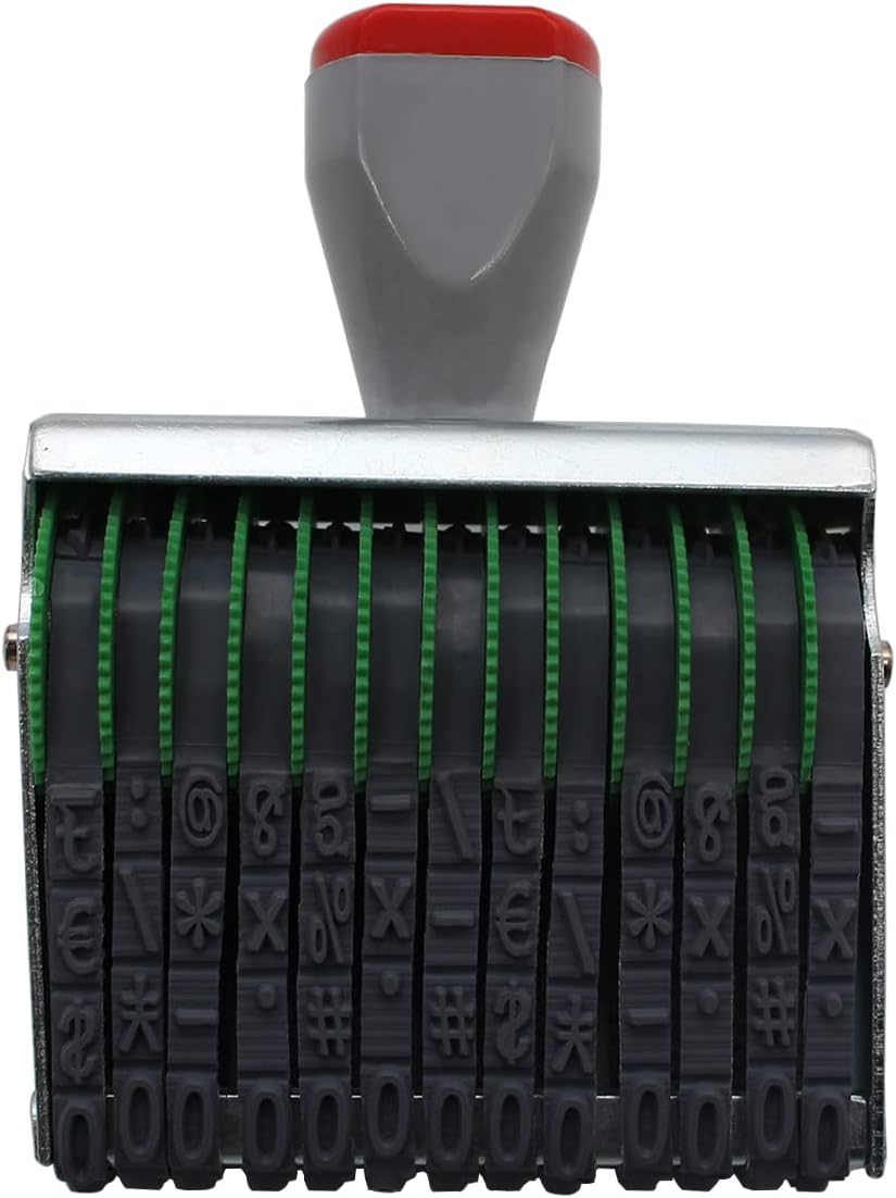- 13 Digit Number Stamps, There are a total of 12 plastic wheel rotating belts. The rotating belt contains ten Arabic numerals from 0 to 9 and some symbols. Each rotating belt can be freely rotated, and you can manually arrange the numbers or symbols you want. Arabic numerals have 0-9 (10 digits) and symbols