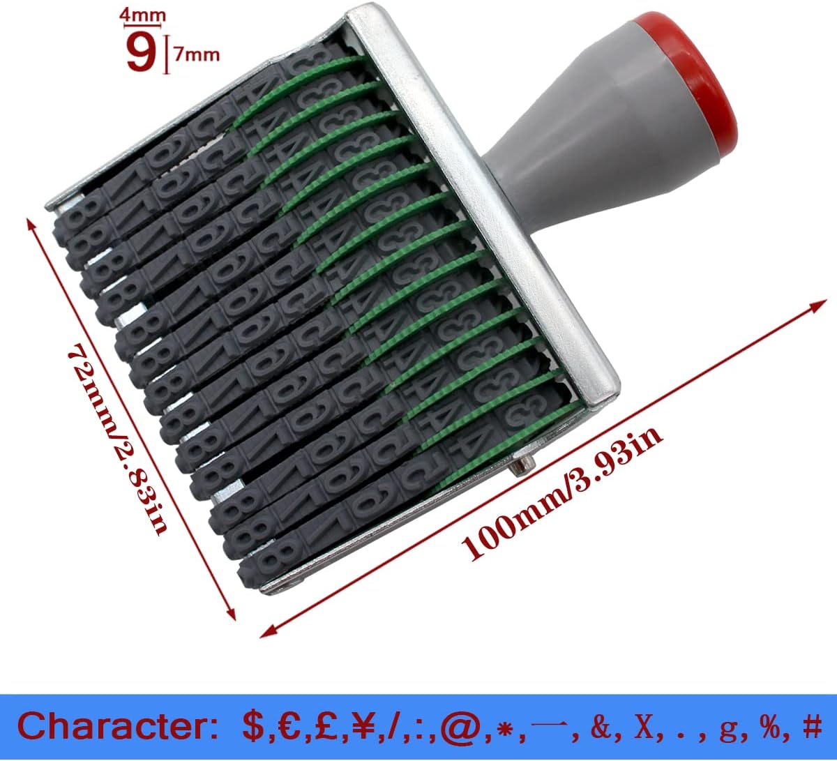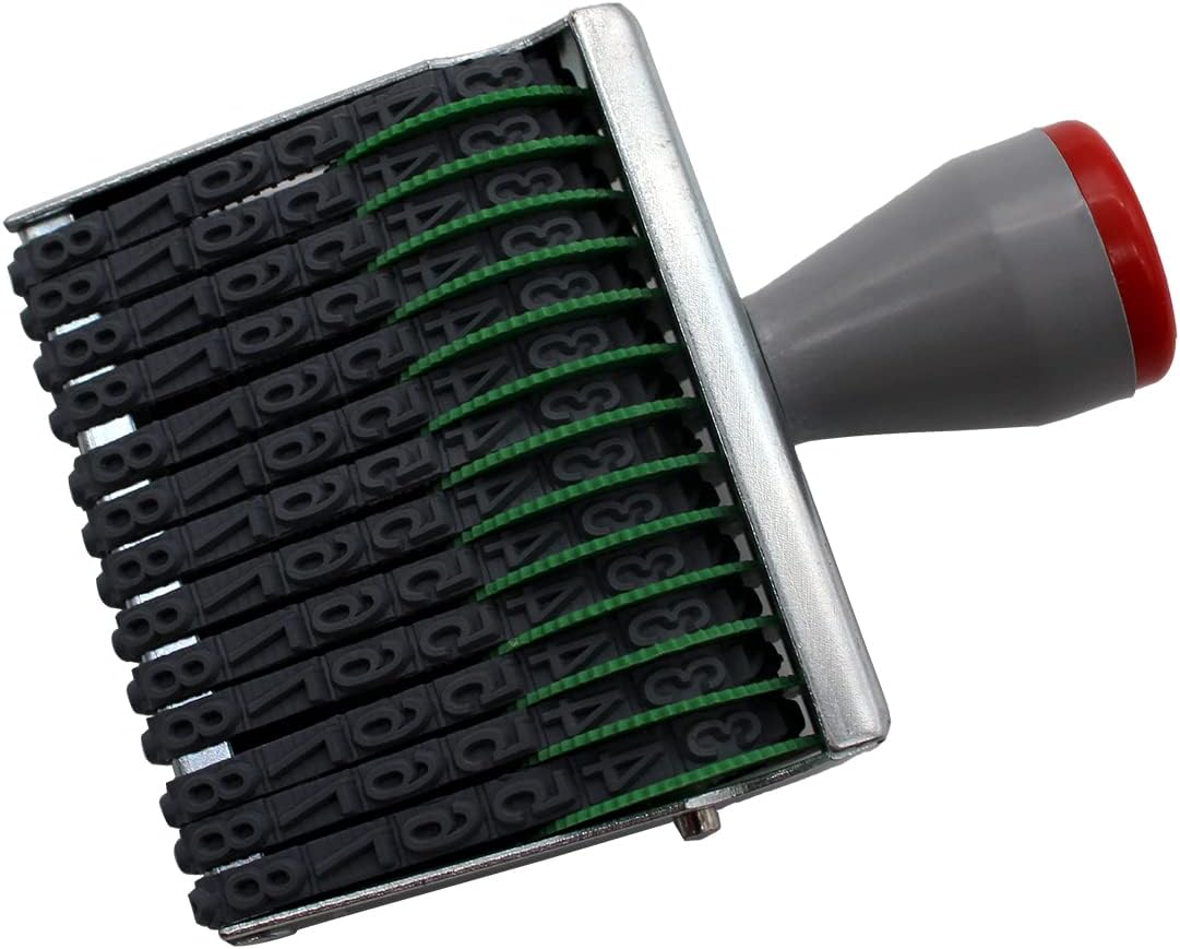 - 13 Digits Rubber Number Stamp: Material : Metal/Plastic. Size:Length :100 mm/3.93 in, Width:72 mm/2.83 in,High:25 mm/0.98 in,Character : Width:4 mm /0.15 in,Height:7 mm/0.27 in, Color : Gray black,Weight: 95 g, Package Content : 1 X Numbering Stamp(Without ink Requires a separate ink pad)