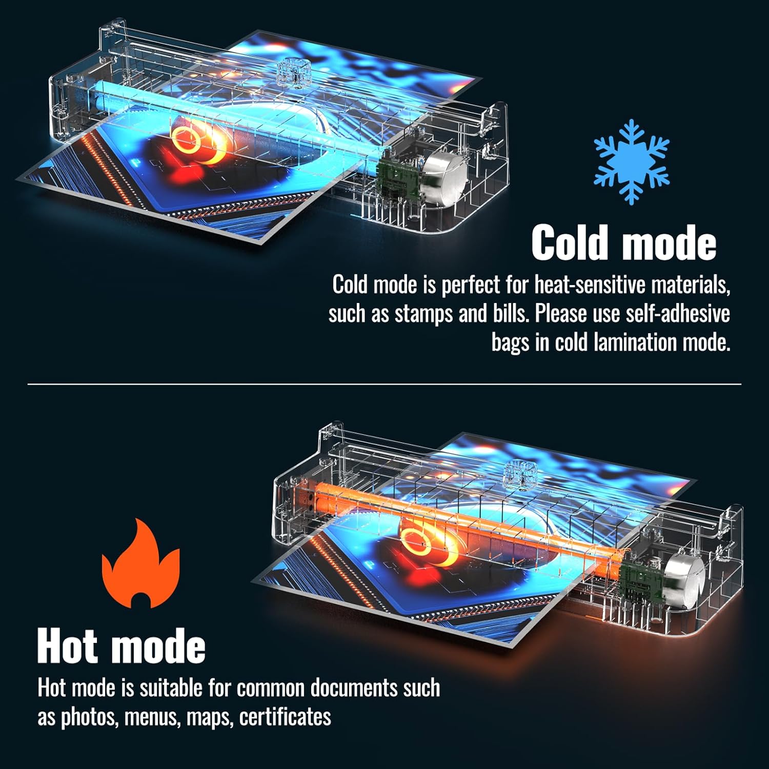 - ✅ 【90s Fast Preheat & Dual Mode Flexibility】No more waiting – 90s start laminating quickly for home projects or office tasks. Hot mode for daily docs; Cold mode for heat-sensitive ink and paint to preserve the color without melting.