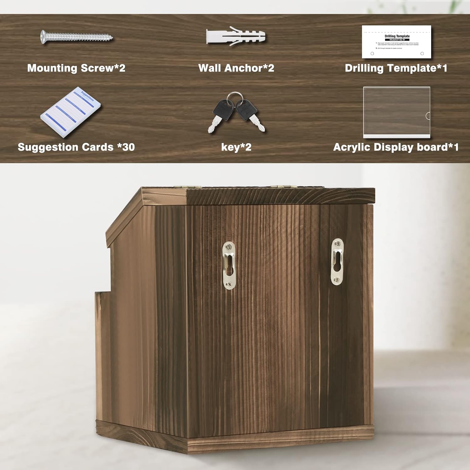 - DURABLE CONSTRUCTION:This suggestion box with lock is durably crafted of rustic wood.Can be mounted to a wall or positioned on any tabletop. Please note that there may be some wood shavings left on the surface of the goods. A simple wipe will easily clean it.