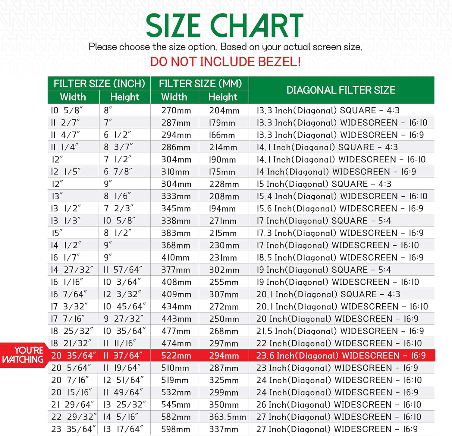 - ☘️ FILTER DIMENSIONS - Width: 20 35/64" (522 mm), Height: 11 37/64" (294 mm), Diagonal: 23.6"W9 ANBAC ATTACHMENT TYPE PRIVACY SCREEN FILTER is compatible with all major brands such as HP, Dell, Samsung, Lenovo, LG, Acer, ASUS, ViewSonic, and the others. Please check your screen's width and height measurement in order to purchase the right filter for your screen size. (We advise that you DO NOT DECIDE your order only based on your screen’s diagonal size).