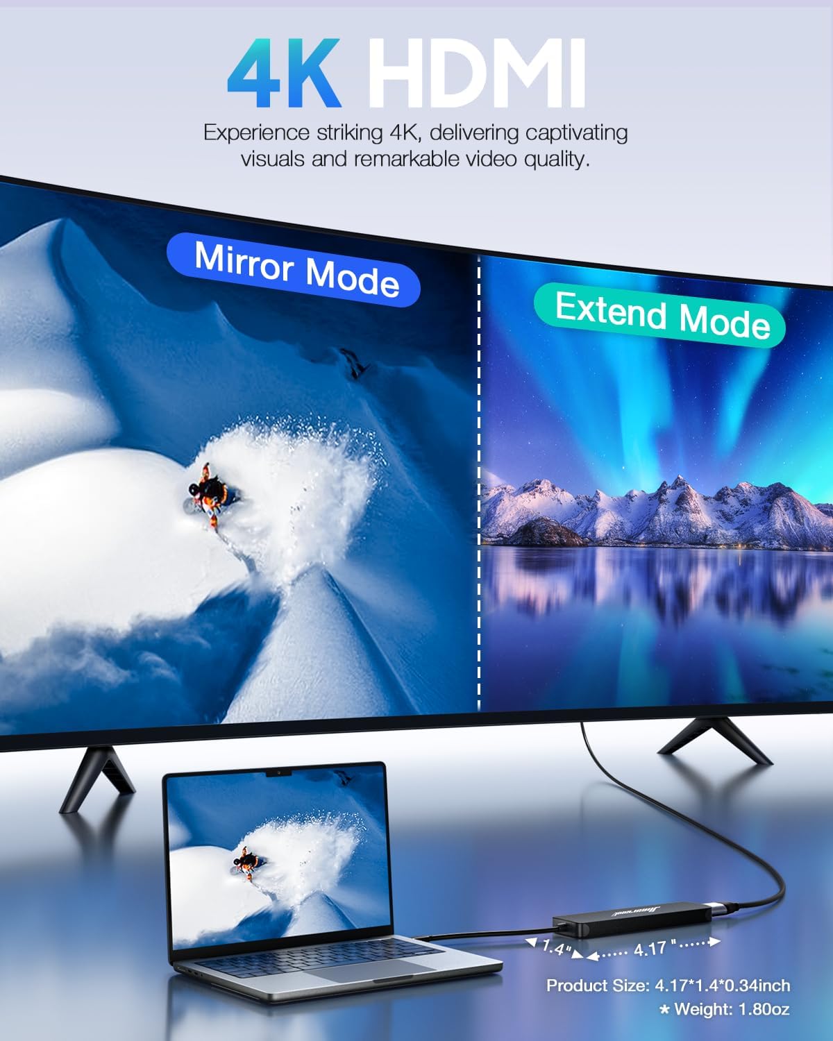 - 4K HDMI Display β Mirror or extend to monitors/TVs/projectors up to 3840Γ2160@30Hz (supports 1080p@60Hz). Requires a USB-C port with DisplayPort Alt Mode; not all phones/tablets support video out
