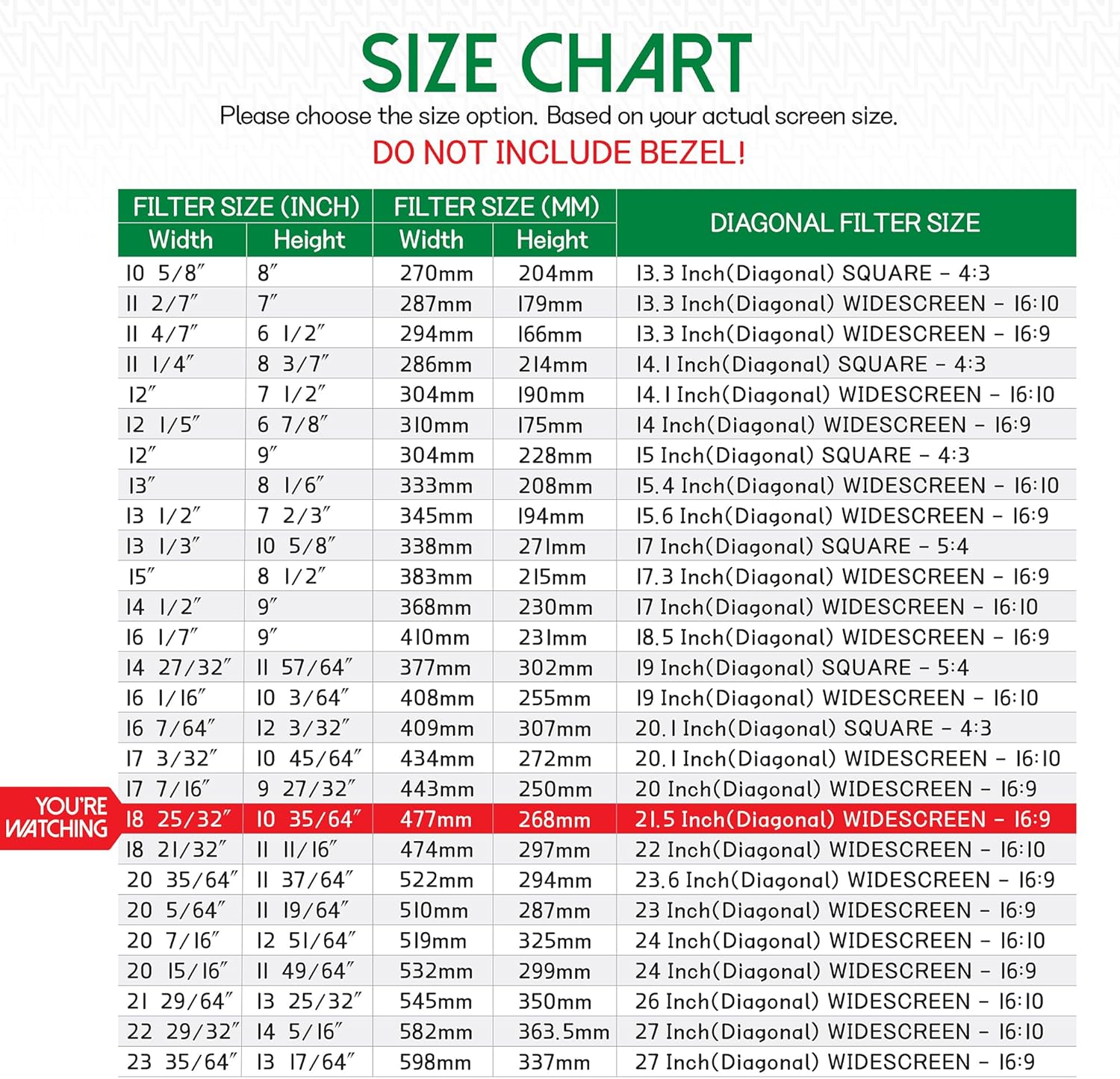 - ☘️ FILTER DIMENSIONS - Width: 18 25/32" (477 mm), Height: 10 35/64" (268 mm), Diagonal: 21.5"W9 ANBAC ATTACHMENT TYPE PRIVACY SCREEN FILTER is compatible with all major brands such as HP, Dell, Samsung, Lenovo, LG, Acer, ASUS, ViewSonic, and the others. Please check your screen's width and height measurement in order to purchase the right filter for your screen size. (We advise that you DO NOT DECIDE your order only based on your screen’s diagonal size).
