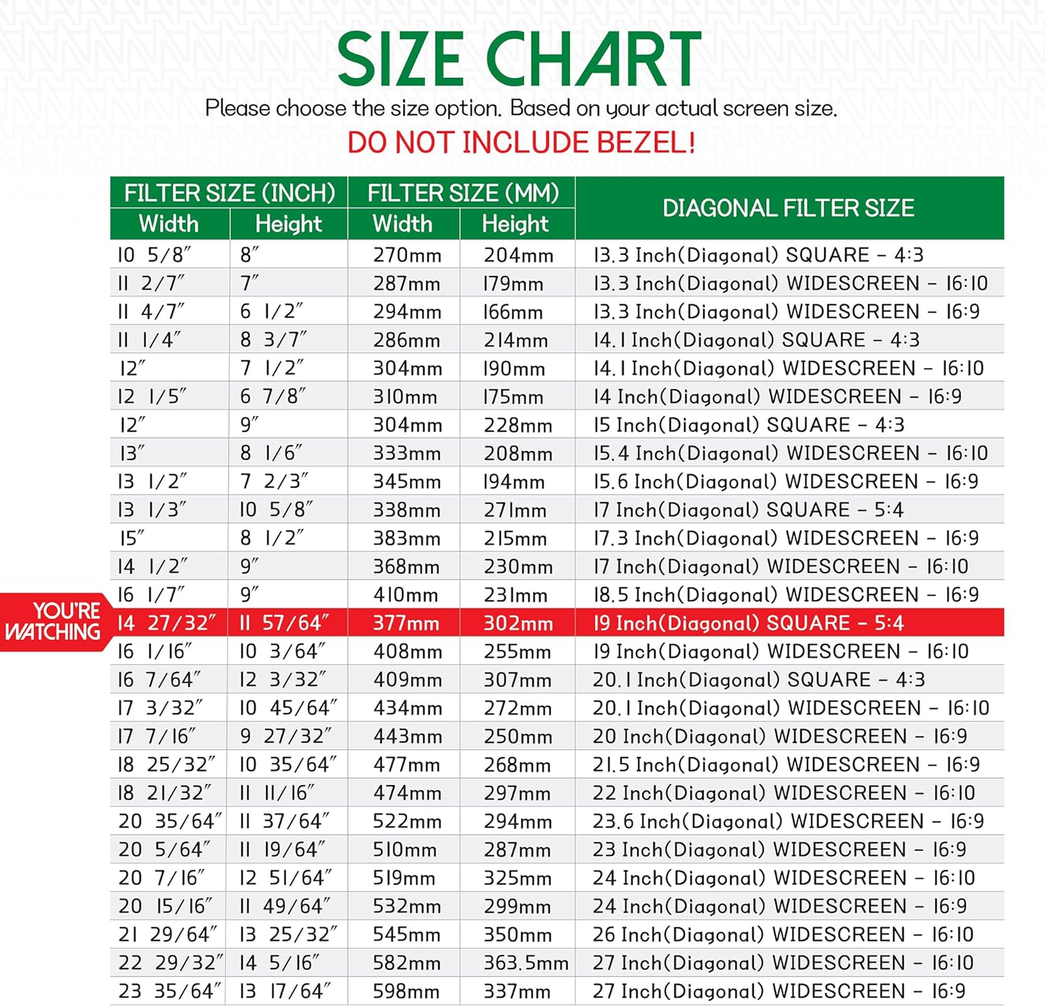 - ☘️ FILTER DIMENSIONS - Width: 14 27/32" (377 mm), Height: 11 57/64" (302 mm), Diagonal: 19" ANBAC ATTACHMENT TYPE PRIVACY SCREEN FILTER is compatible with all major brands such as HP, Dell, Samsung, Lenovo, LG, Acer, ASUS, ViewSonic, and the others. Please check your screen's width and height measurement in order to purchase the right filter for your screen size. (We advise that you DO NOT DECIDE your order only based on your screen’s diagonal size).