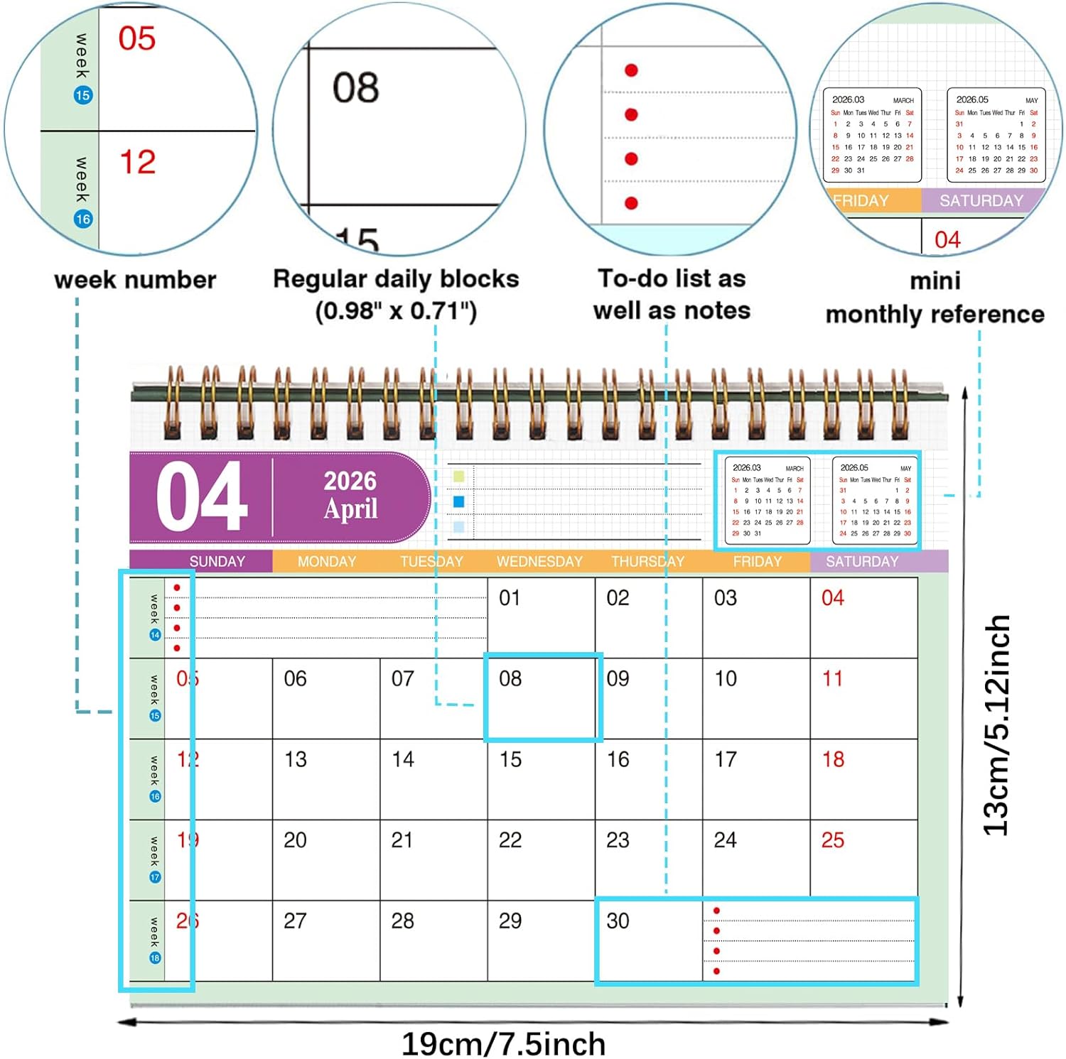 - šļø SMALL DESK CALENDAR - Size : 7.5 x 7 x 3.5 inch (19 x 17.5 x 9cm), Standing flip calendar has To-do list as well as notes +ruled daily blocks (0.98" x 0.71") + week number + mini monthly reference on the top and Notes area on back page, keep plans neat and legible, you ample space for scheduling your busy life.
