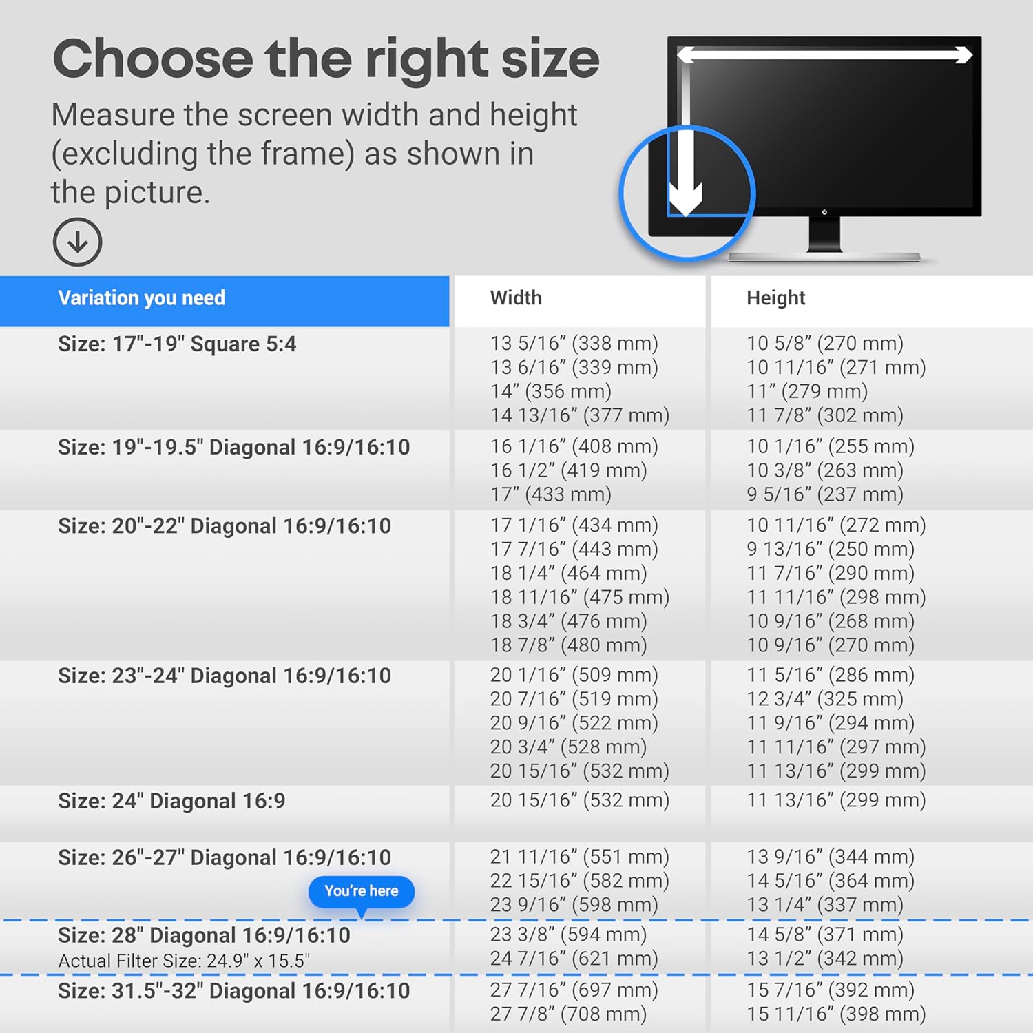 - Ideal Fit: Blue light screen for monitor fits screens sizes of 28". Actual filter size: Width: 24.9 inches (633mm), Height: 15.5 inches (395mm). Ideally compatible with HP, Samsung, Dell, ASUS, LG, Huawei, MSI, and other monitor and laptop brands