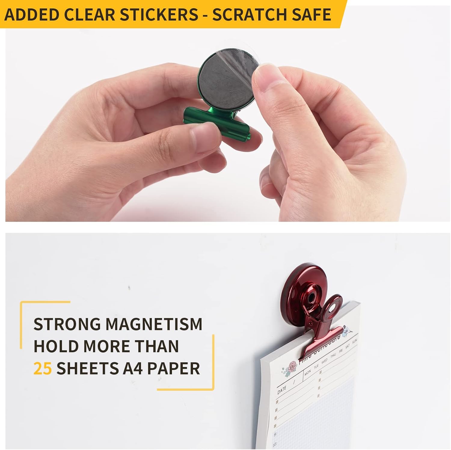 - 【Scratch Safe Magnet Clips】Magnetic clips for refrigerator have the smooth polished metal edge to contacts any metallic surface directly. Our magnet clips for fridge add with clear stickers to prevent scratches on metal surfaces without weakening the strong magnetism. No worry about the scratches anymore !