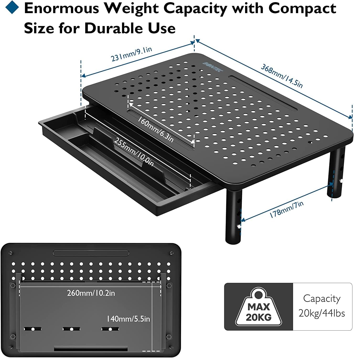 - STABLE STRUCTURE WITH STRONG CAPACITY-SAVING DESIGN - The desk monitor stand, crafted with reinforced steel and four anti-slip feet, delivers stability and durability. Supporting up to 44lbs, the adjustable monitor stand accommodates desktop monitors, laptops, printers, and iMacs with ease. The secure construction protects valuable devices, ensures reliability in daily use, and offers peace of mind whether in offices, classrooms, or home setups