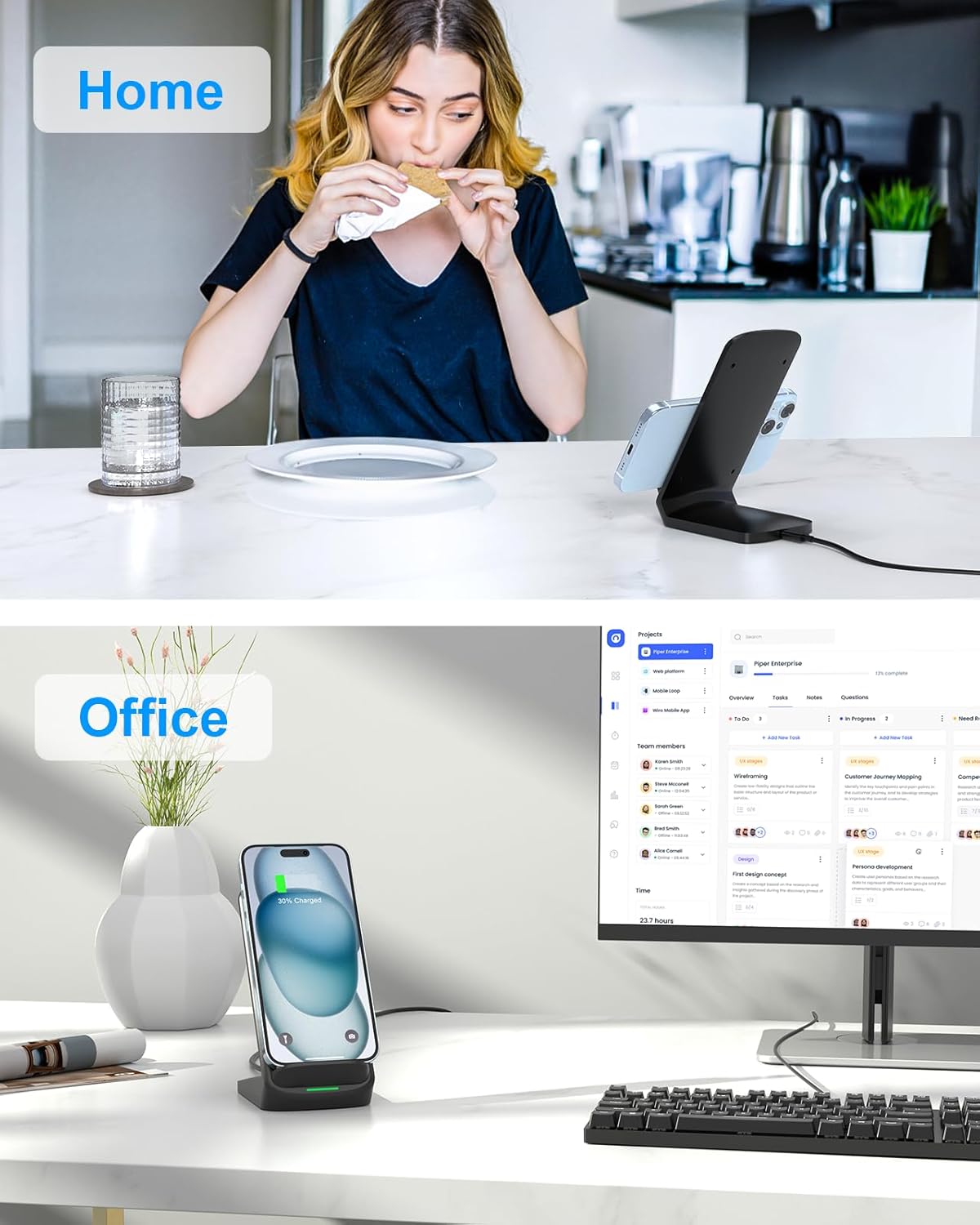 - [Safe & Reliable] Features internal safeguards against overcharge, overcurrent, overvoltage, and overheat, we ensure ultimate safety for your smartphone, anti-slip bottom silicone rim and raised support give extra stability for any desk surface.