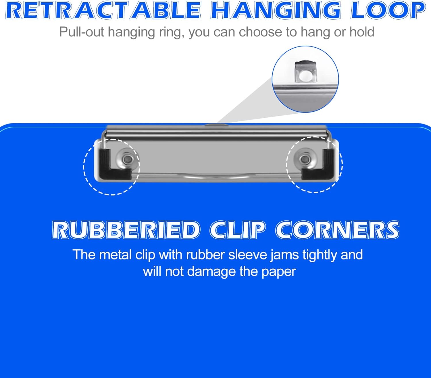 - RETRACTABLE HANGING LOOP: The clipboards have a built-in hanging hole, which can help you place your documents randomly. And it can be stowed away when not needed