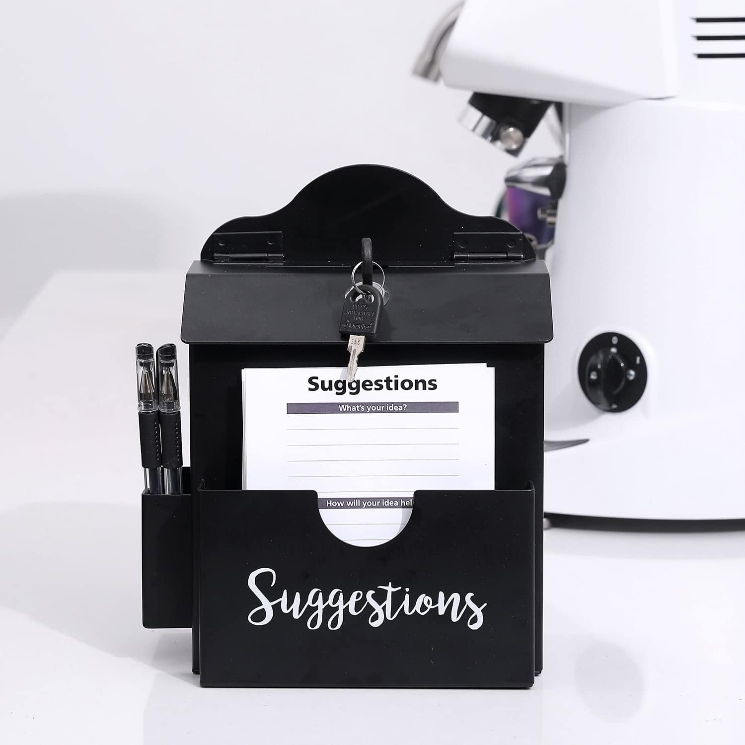 MyGift Classic Matte Black Metal Suggestion Box with Cursive Suggestions Lettering, Wall Mounted or Tabletop Comment Box with Lock, Keys, Paper Sheet and Pen Holder Slots