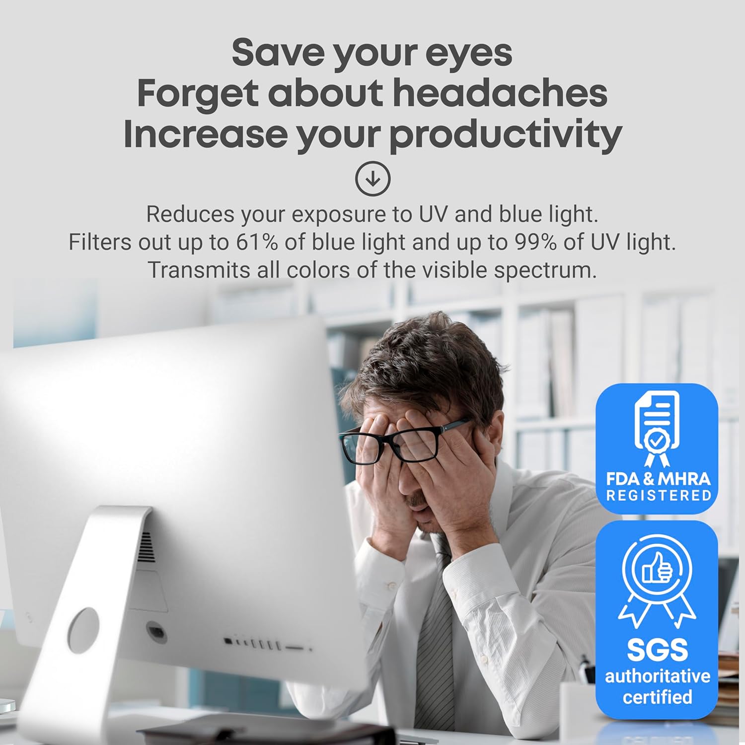 - Eye Comfort: Blue light screen protector reduces eye strain by filtering up to 61% of blue light and 99% of UV light. This blue light screen protector doesn’t have an Anti-Glare function
