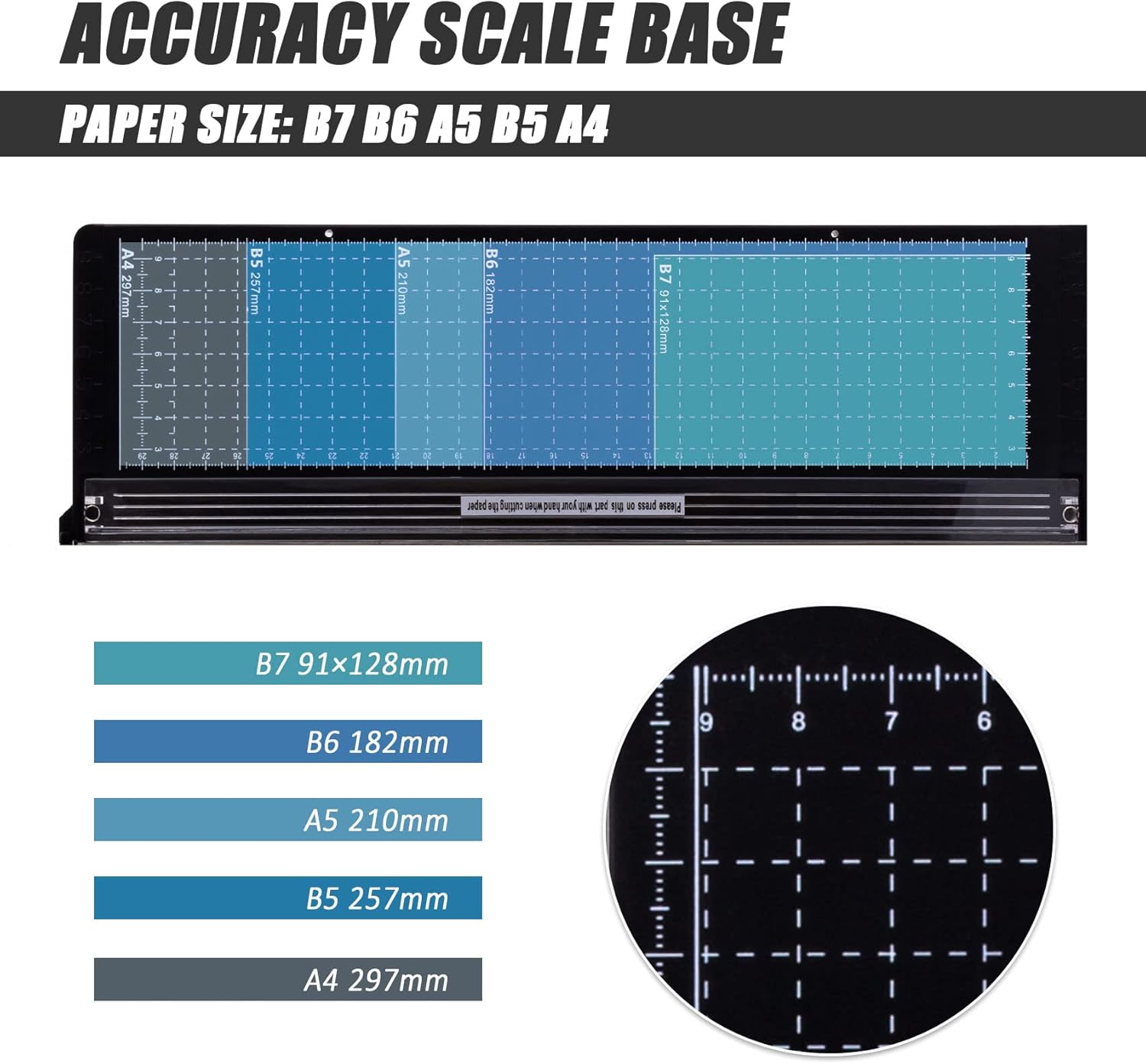 - EFFORTLESS SHARP CUTTING : Ergonomic Design arm and long handle, more effortless when cutting paper. Upgrade steel blade cut paper more neatly and smoothly;Paper Trimmers range: B4, A4, B5, A5, B6, B7;Not suitable for cutting fabric, leather, metal plates;Say goodbye to cutting struggles