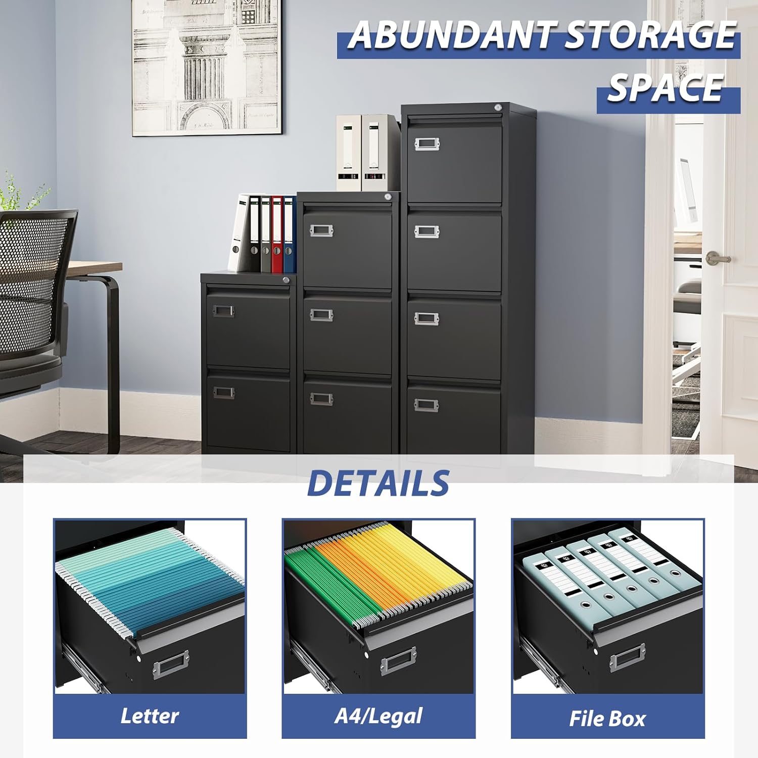 - ăLarge-Storage SpaceăThe lateral file cabinet is deeper than similar file cabinets, with fully extended silent slide rails, easy to open and close, each drawer is also equipped with adjustable hanging rails, perfect for storing letter/legal/A4/F4 size folders, and Meet your different needs.