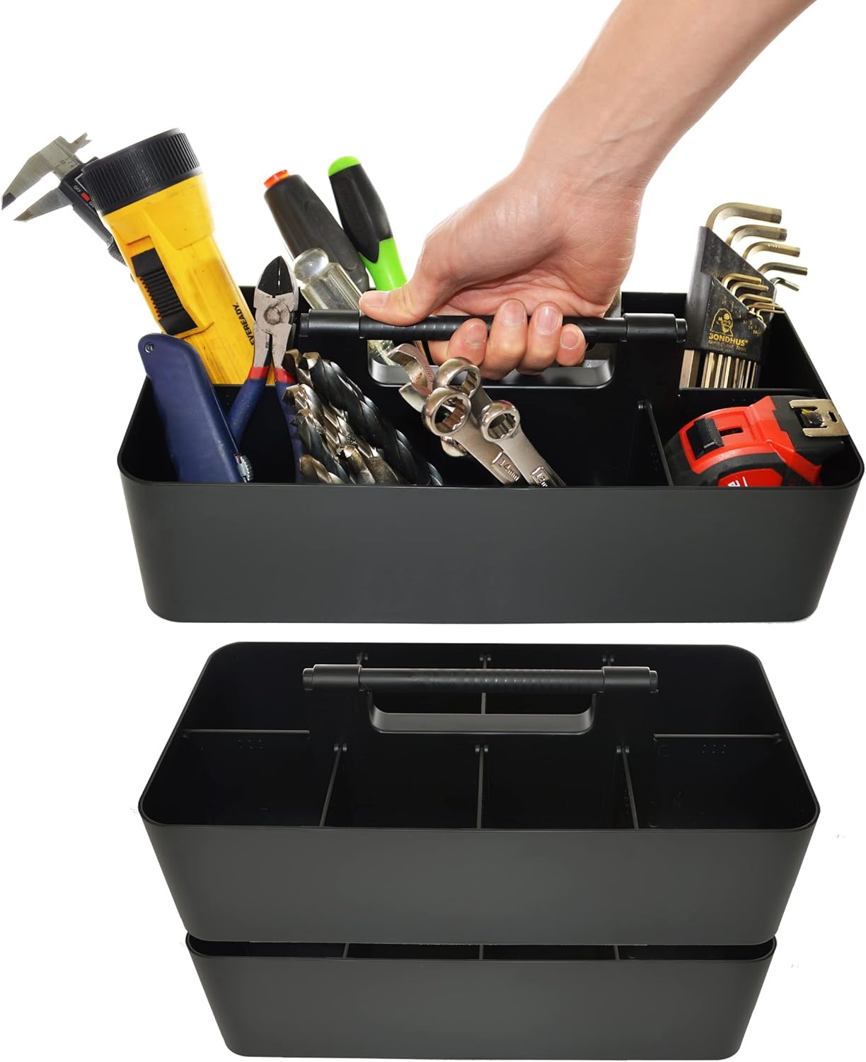 - PORTABLE: Feature easy-carry round smooth handle to make it simple to transport goods from shelf to cabinet or desktop; Just grab and go; The perfect storage and organizing solution for modern living spaces; Open tops and divided compartments make it easy to see what is inside and quickly grab what you need; Use these convenient storage bins to keep office desk items all in one place; Great for children's crafting items and school supplies too; Perfect for home or commercial workspace