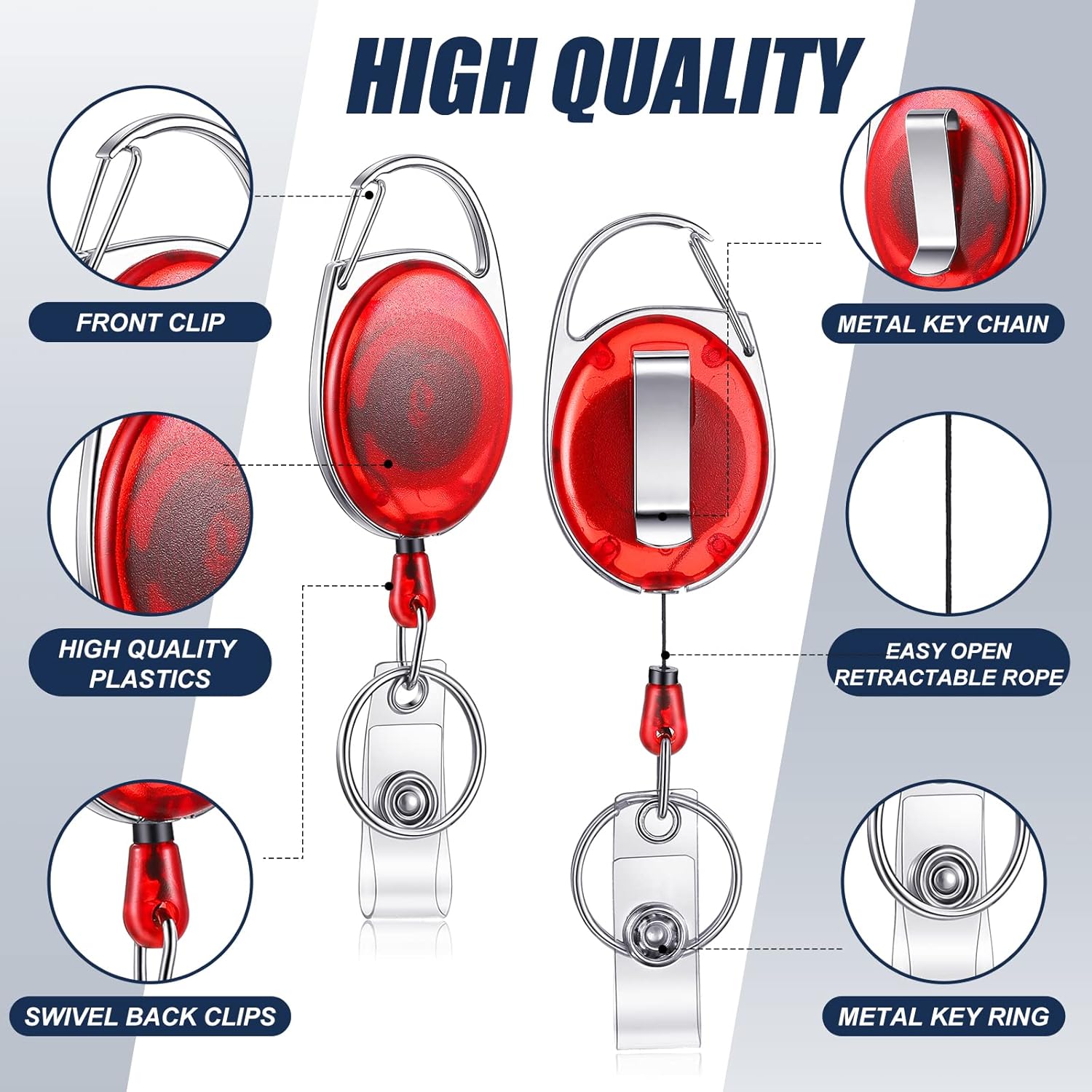 - Quality Material: retractable badge reel is made of quality metal material, with stainless steel key ring, standard vinyl band clip, textured plastic round reel housing and fiber rope made of abrasion resistant polyester material, compact and strong, retractable force high, long-term use