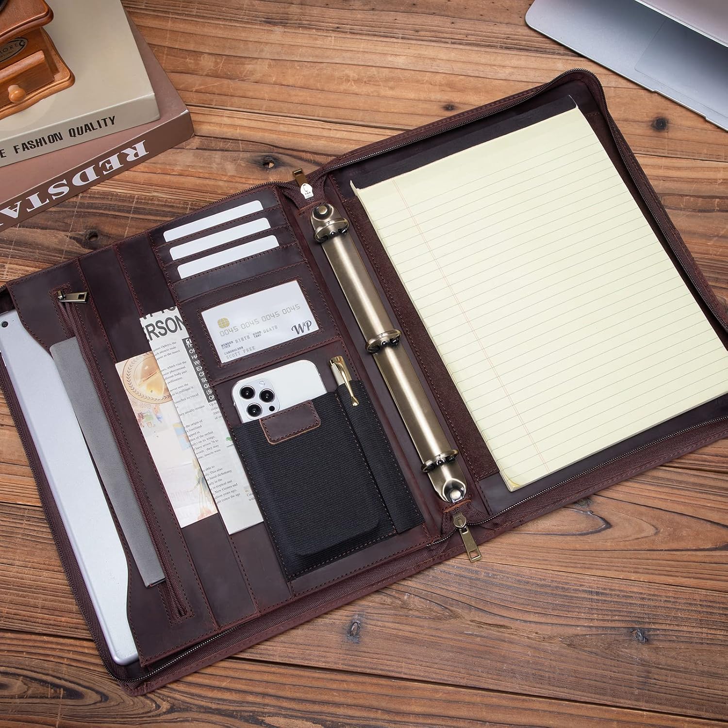 - 3-Ring Binder and A4 Notepad Holder: The 1β 3-ring binder is capable of holding 80-150 sheets, depending on paper weight. Paired with a dedicated A4 or US Letter Size (8.5" x 11") Notepad Holder, our leather portfolio provides a comprehensive solution for your professional needs. Effortlessly carry essential documents and easily jot down ideas in your A4-sized notepad, ensuring youβre perfectly equipped for any business scenario.