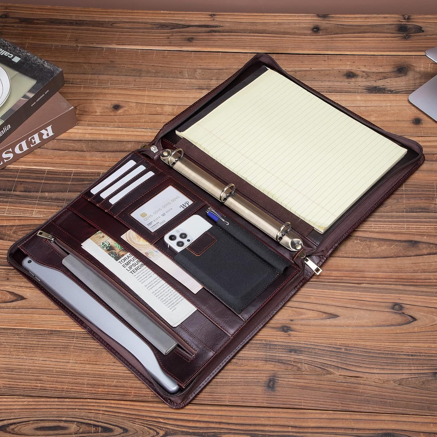 Genuine Leather Portfolio with 3 Ring Binder, Full Grain Leather Padfolio Zippered, A4 Notebook Holder Laptop Sleeve Professional Folder Organizer Gift for Men and Women, Dark Brown, Oil Tanned