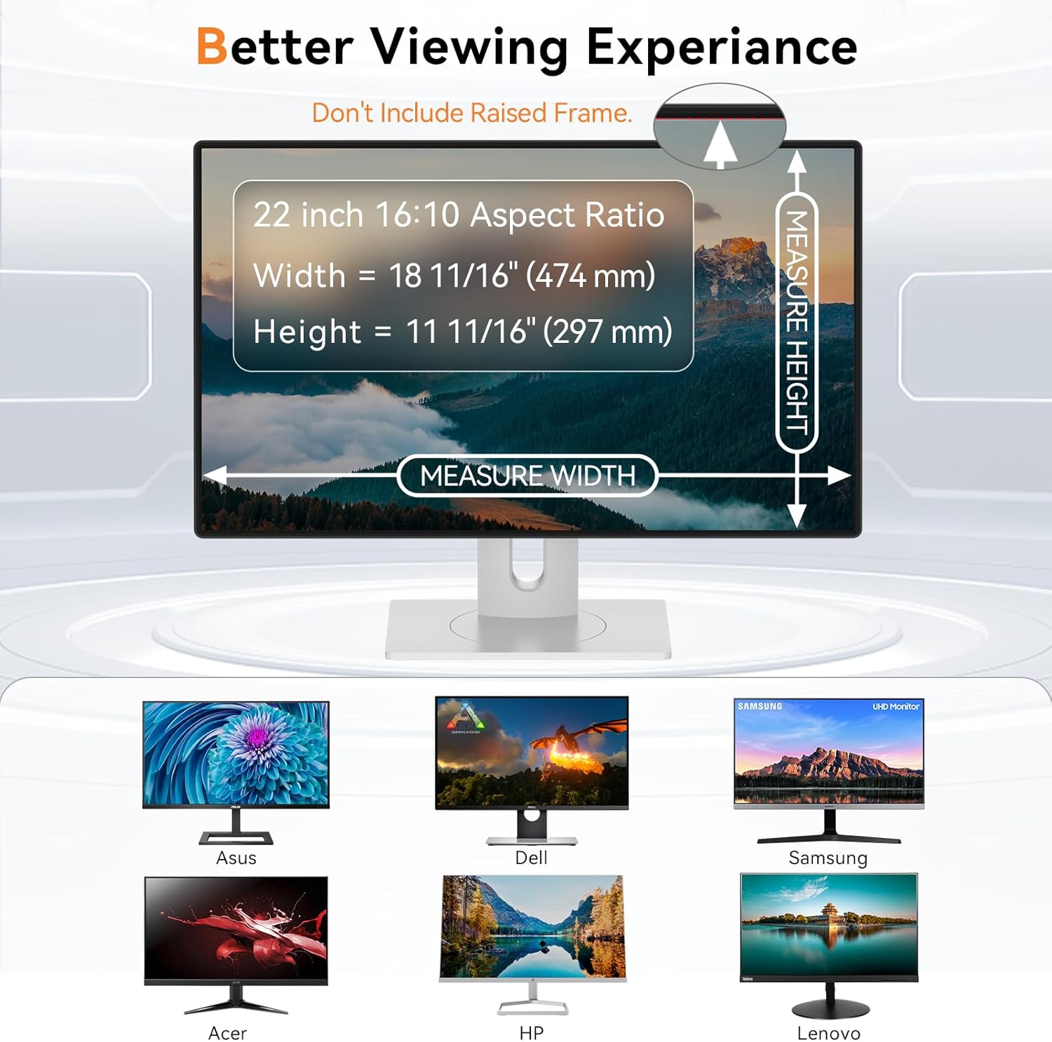- Privacy Filter Dimensions — Width: 18 11/16" (474 mm), Height: 11 11/16" (297 mm), Diagonal: 22" (558.8 mm). Contact us if you have any questions about dimensions. Mamol computer privacy filter is designed to be ideally compatible with HP, Samsung, Dell, Lenovo, Acer, Asus, LG, ViewSonic, and other monitor brands. Please confirm the width and height measurements for your computer screen before ordering.