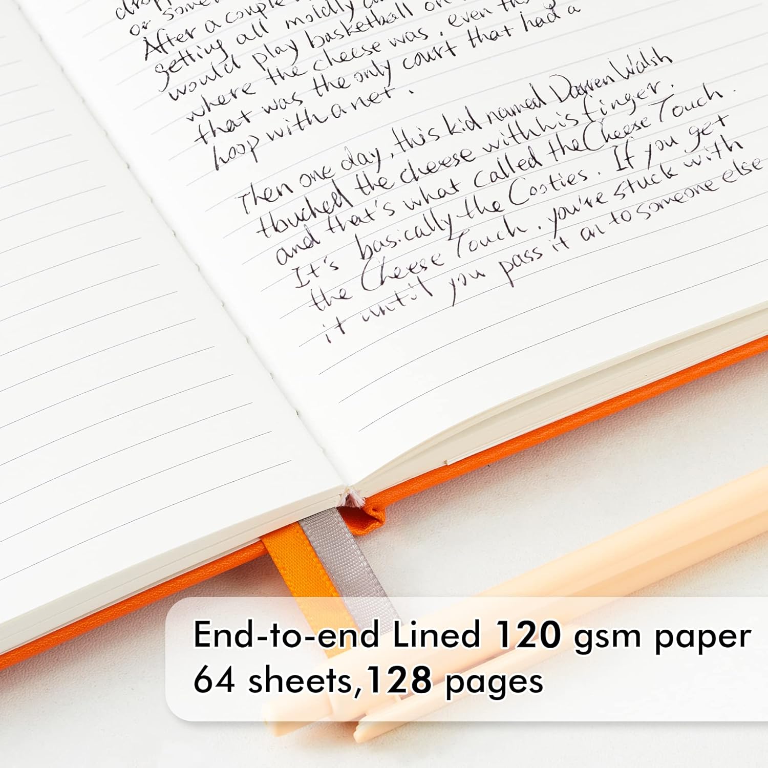 - These classic ruled notebooks are all blank inside with 128 lined pages (64 sheets), which would be convenient for daily usage. The hard cover journal has a water-resistant faux leather cover, round corners and bookmarks, which is designed to lay and open flat. There’s a “date/page” column on the top of every page. You can use it as a reminder to let you remember those important dates and find the page you want in a very short time.