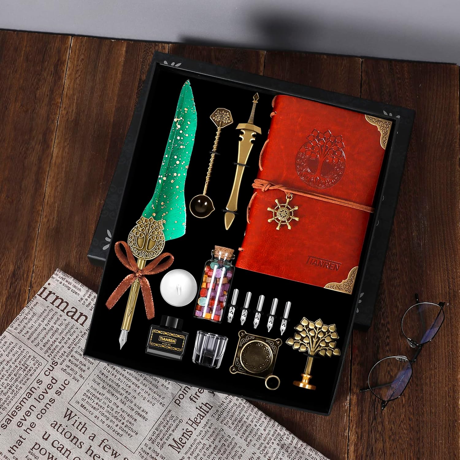 - 【Calligraphy Pen Set Included】-1 x feather dip Pen, 1 x bottle of black Ink,1 x bronze pen holder,1 x metal wax seal stamp,1 x bottle of wax sealing beads,1 x glass cup,1 x bronze wax melting spoon,1 x bronze letter opener,5 x different sizes stainless steel replaceable nibs,1 x round white wax,1 x refillable pu leather notebook,1 x vintage envelope,1 x vintage writing paper,1 x unique gift box,the TIANREN antique quill pen ink set meets everything you need it.