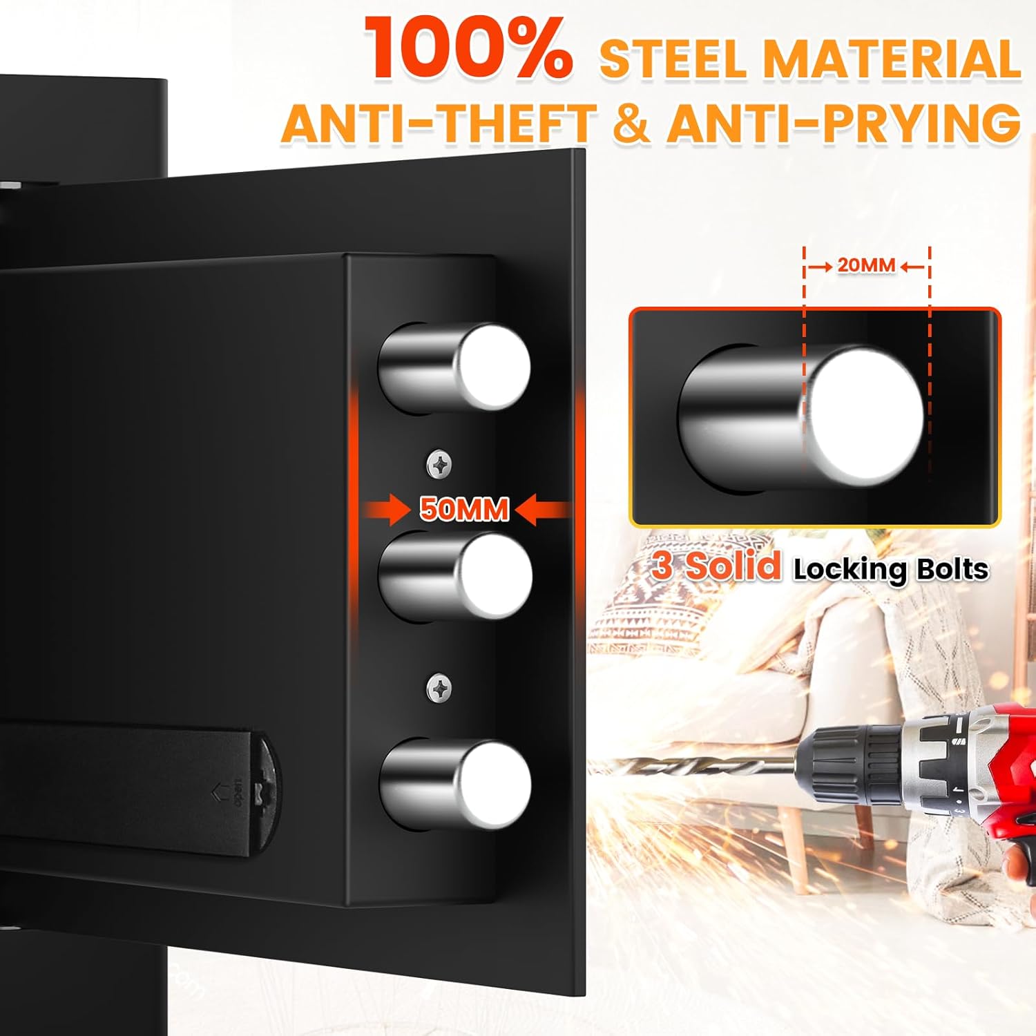 - THREE UNLOCKING METHODS: 1.Equipped with a tamper proof digital keypad lock to prevent strangers from opening it at will; 2.Two emergency keys for faster and more direct access; 3.Hiding the emergency battery box, when you forget the password or the battery runs out, you can open the safe