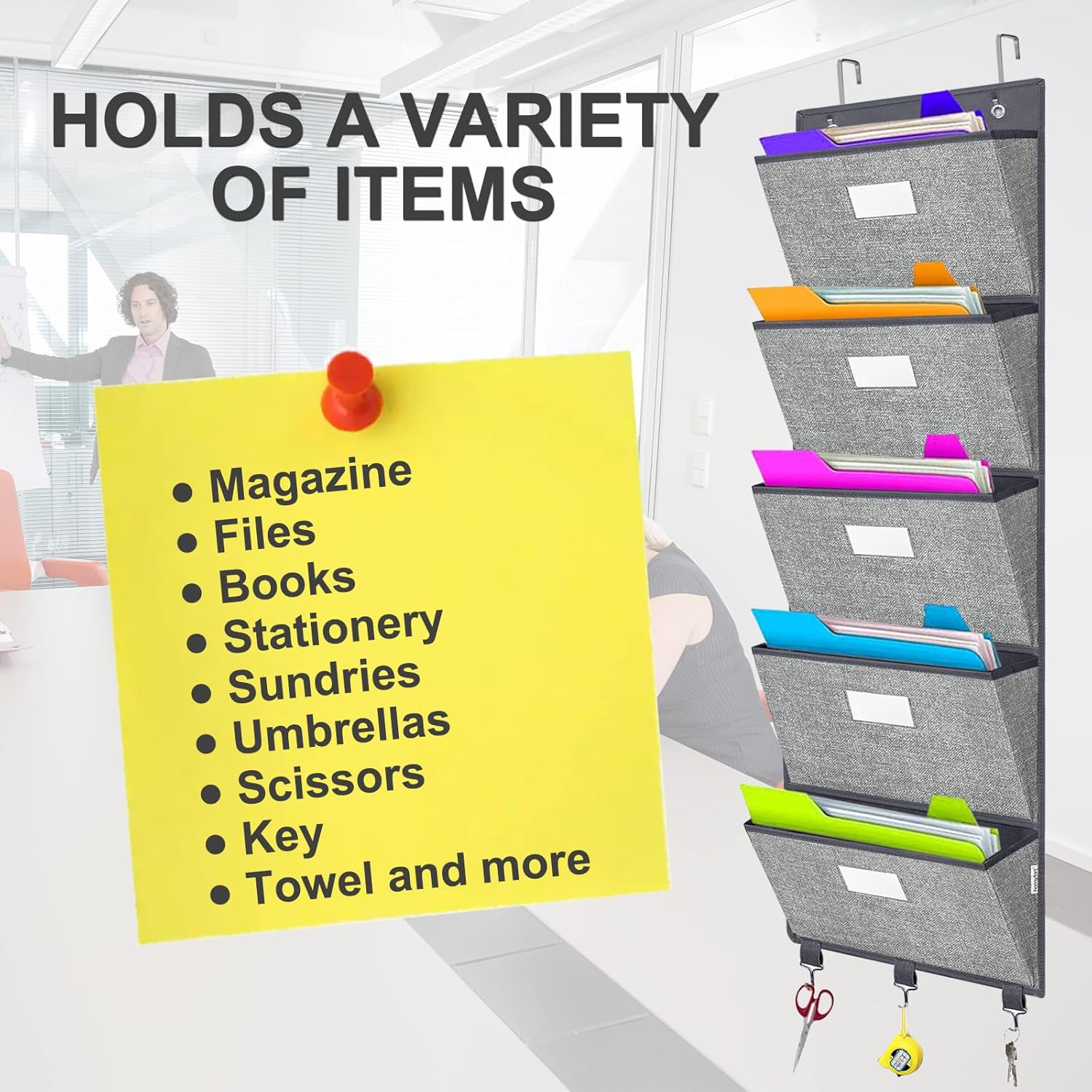 homyfort Over the Door Wall File Organizer, Hanging File Folders Organizer with 5 Large Pockets for Office and Back to School Supplies, Papers, Charts, Mails, Magazine Storage and Organization