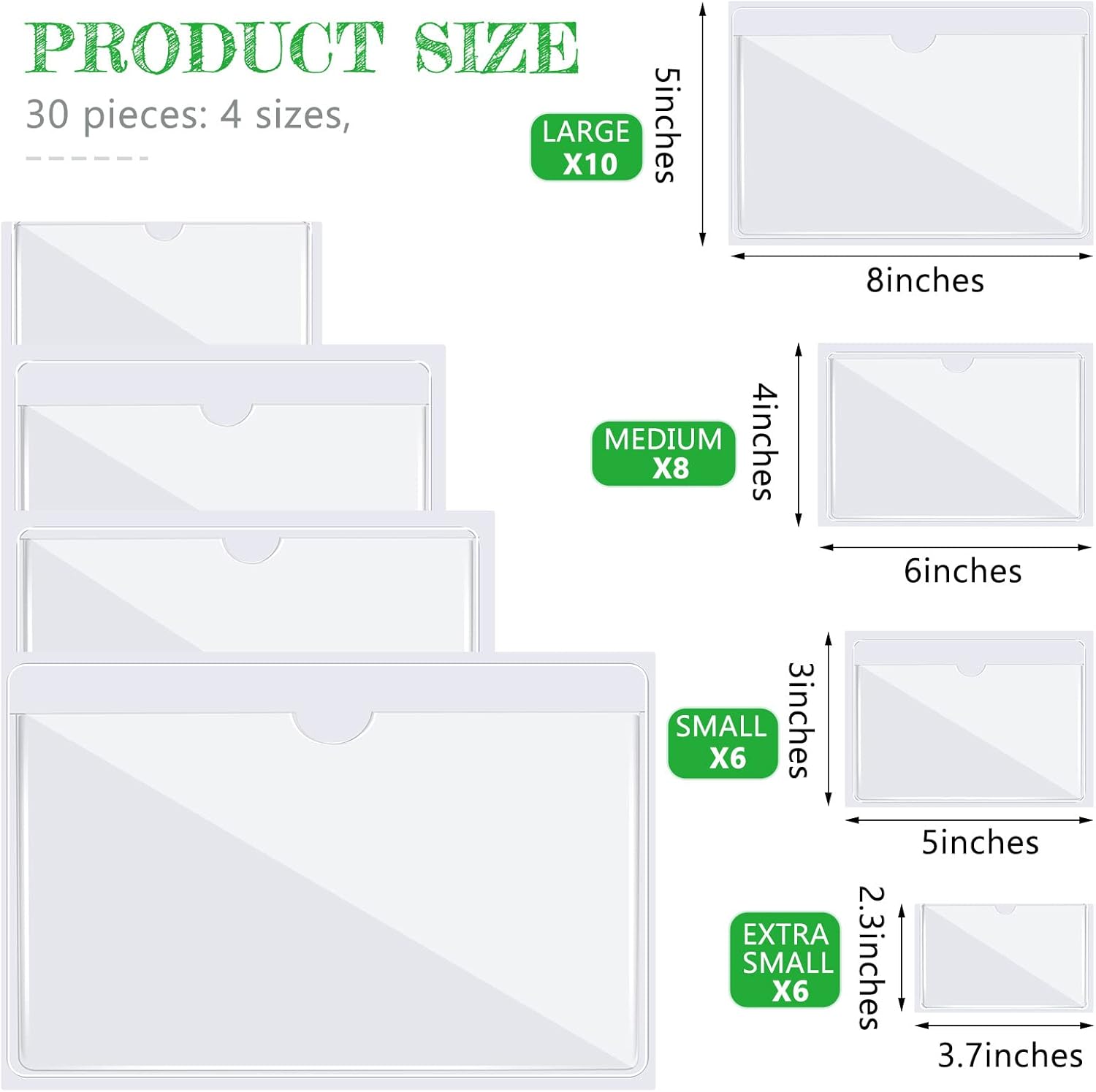 - Applicable Cards: this is a mixed size package, the outer size range of clear adhesive pockets is from 8.67 x 5.83 inches to 3.93 x 2.4 inches, fits cards size from 8 x 5 inches to 3.7 x 2.3 inches; You will recieve 30 self-adhesive card holder for labels, waterproof, dustproof and fingerprint-resistant