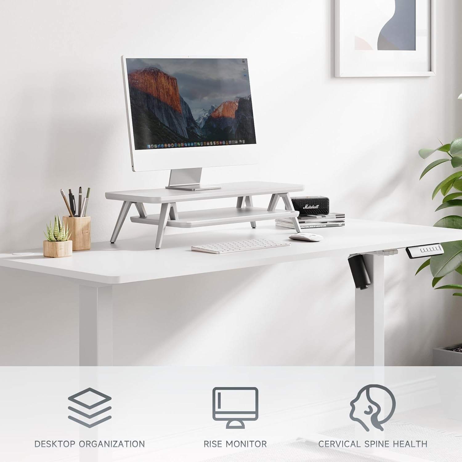 - 【2 Tier Desktop Organizer】At longest 23.6inch wide, It has a universal device holder slot and a high capacity compartments. You can easily store your office accessories & supplies under your monitor stand to keep your desktop tidy. Our monitor stand rise comes with cable management slots that can make your cord stay organized.