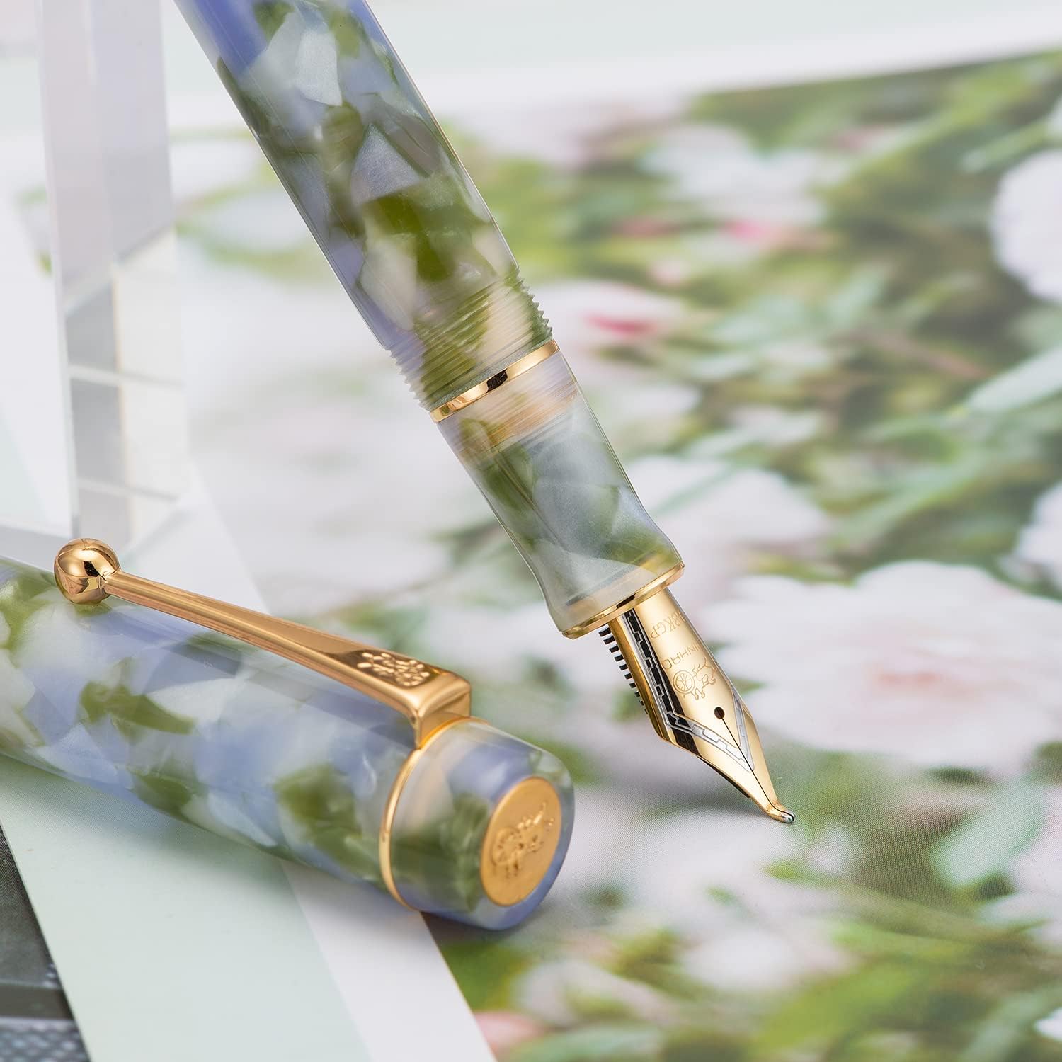 - The acrylic resin celluloid evokes a vintage aesthetic, particularly marble color design that appears in this pen