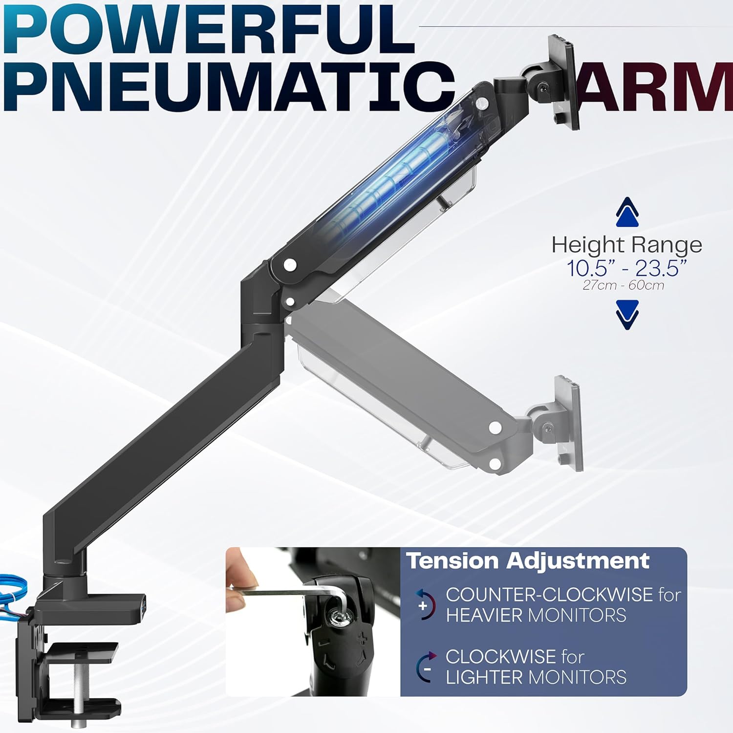 - Fully Adjustable: Mount offers a range of flexible motion featuring -30° to +45° tilt, 180° swivel, 180° rotation, and 13 inches of smooth height adjustment with pneumatic spring lift