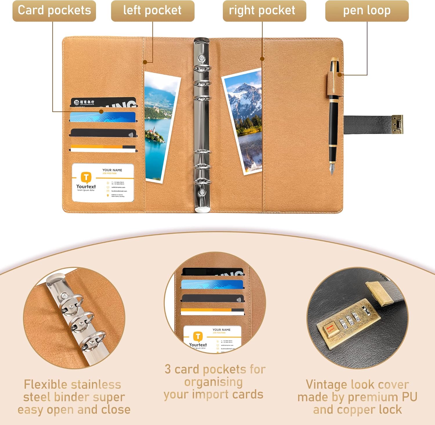 - Multifunctional Password Book: Featuring a durable 6-ring binder crafted from premium PU with a delicate touch and wear-resistant finish, our organizer includes 3 card slots, 2 interior pockets, and a pen holder. Efficiently store and organize bills, passports, ID cards, invoices, tickets, stationery, and more. Ideal for studying, business, reading, meetings, camping, daily planning, and hiking.