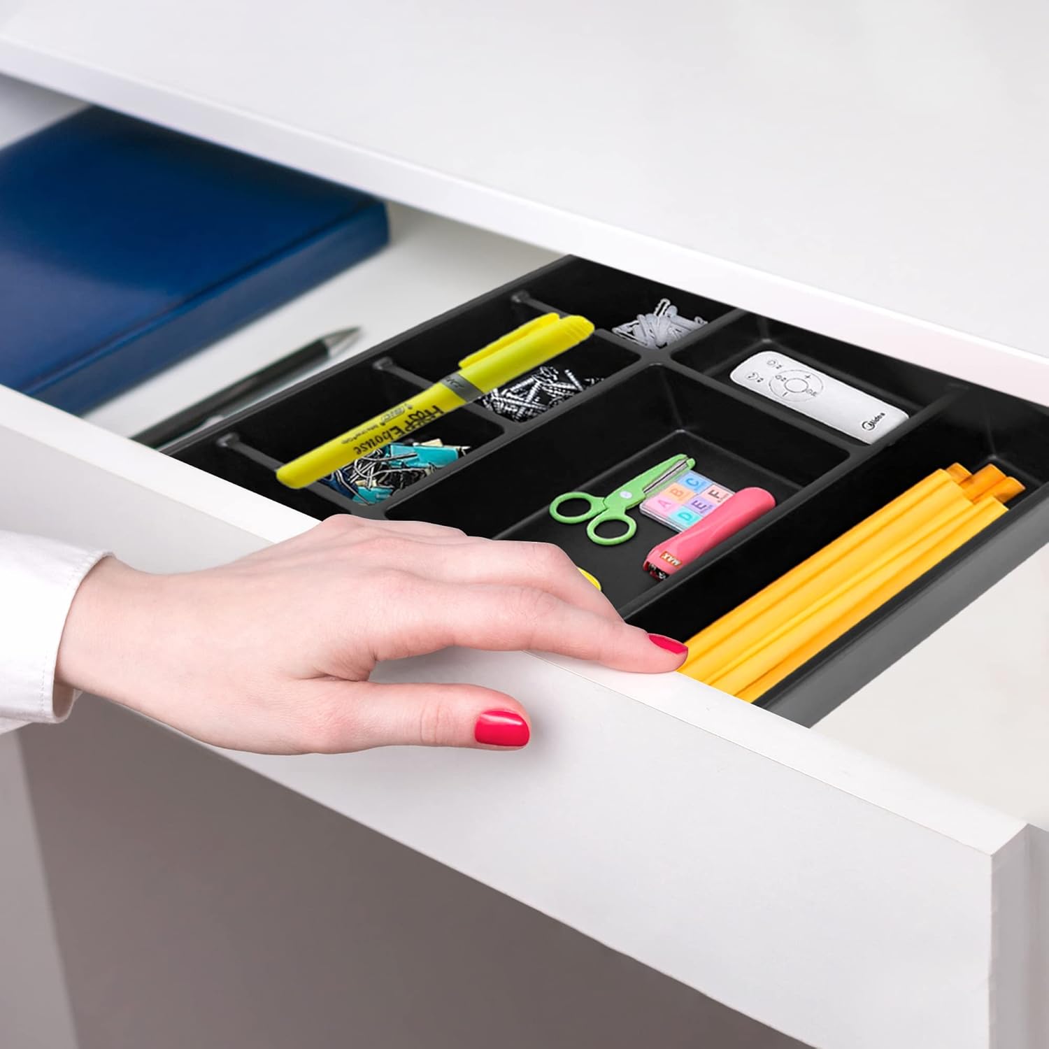 - Notched groove on small compartment to hold your go-to pen. Designed to fit in most standard drawers of file cabinets and pedestals.