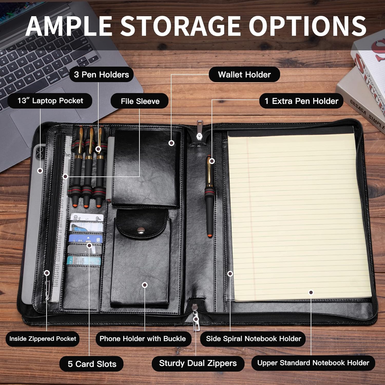 - Large Capacity for More Papers: The leather portfolio is thick with enough room and multiple pockets so you can carry more files and paper inside. Friendly to store paper and easy to close without bulges. The dual YKK zippers enclosure makes it smooth to zip. No more worry about damaging paper or stuck zipper.