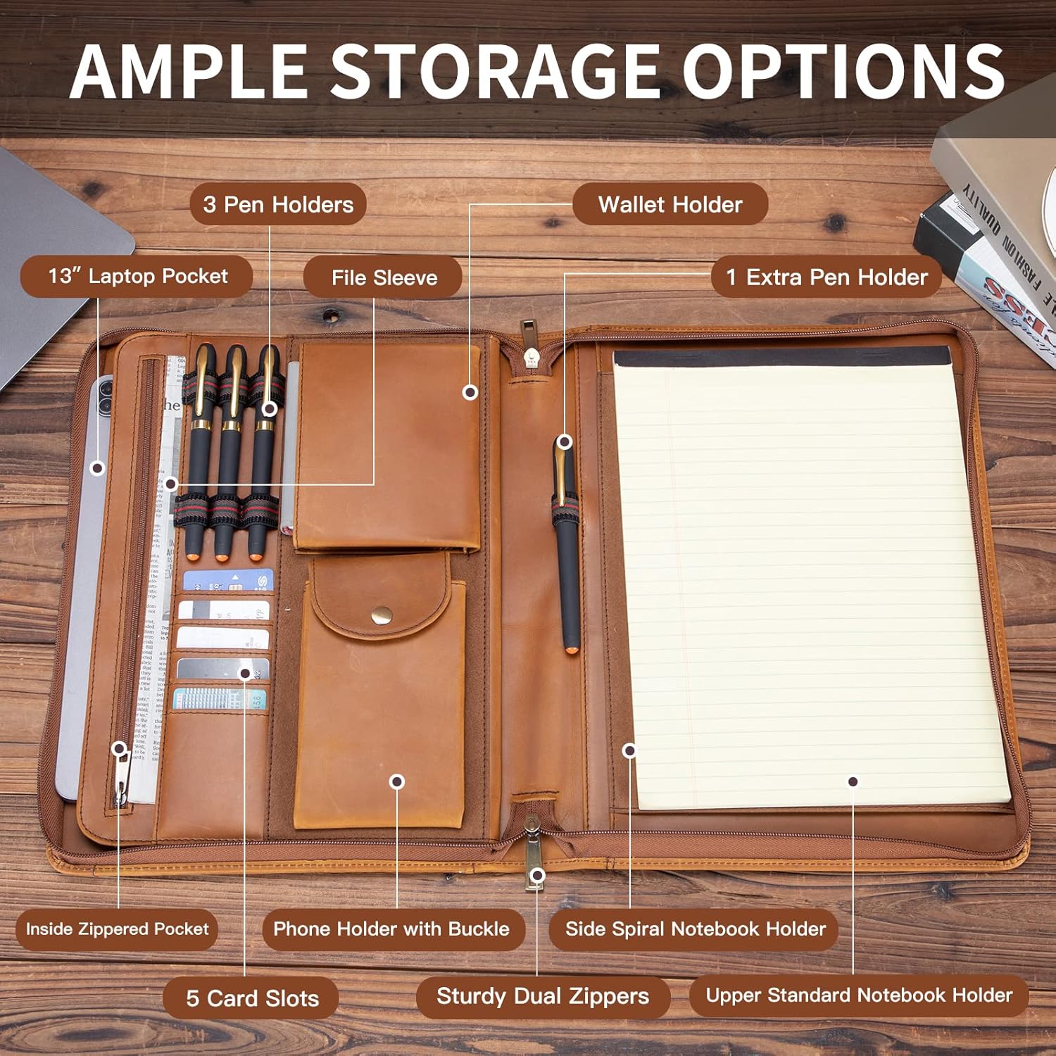 Genuine Leather Portfolio with Front Pocket for Men and Women, Zippered Padfolio Binder 8.5 x 11 Legal Pad Notebook Holder, Fits 13” Laptop, Professional Work File Case, Brown
