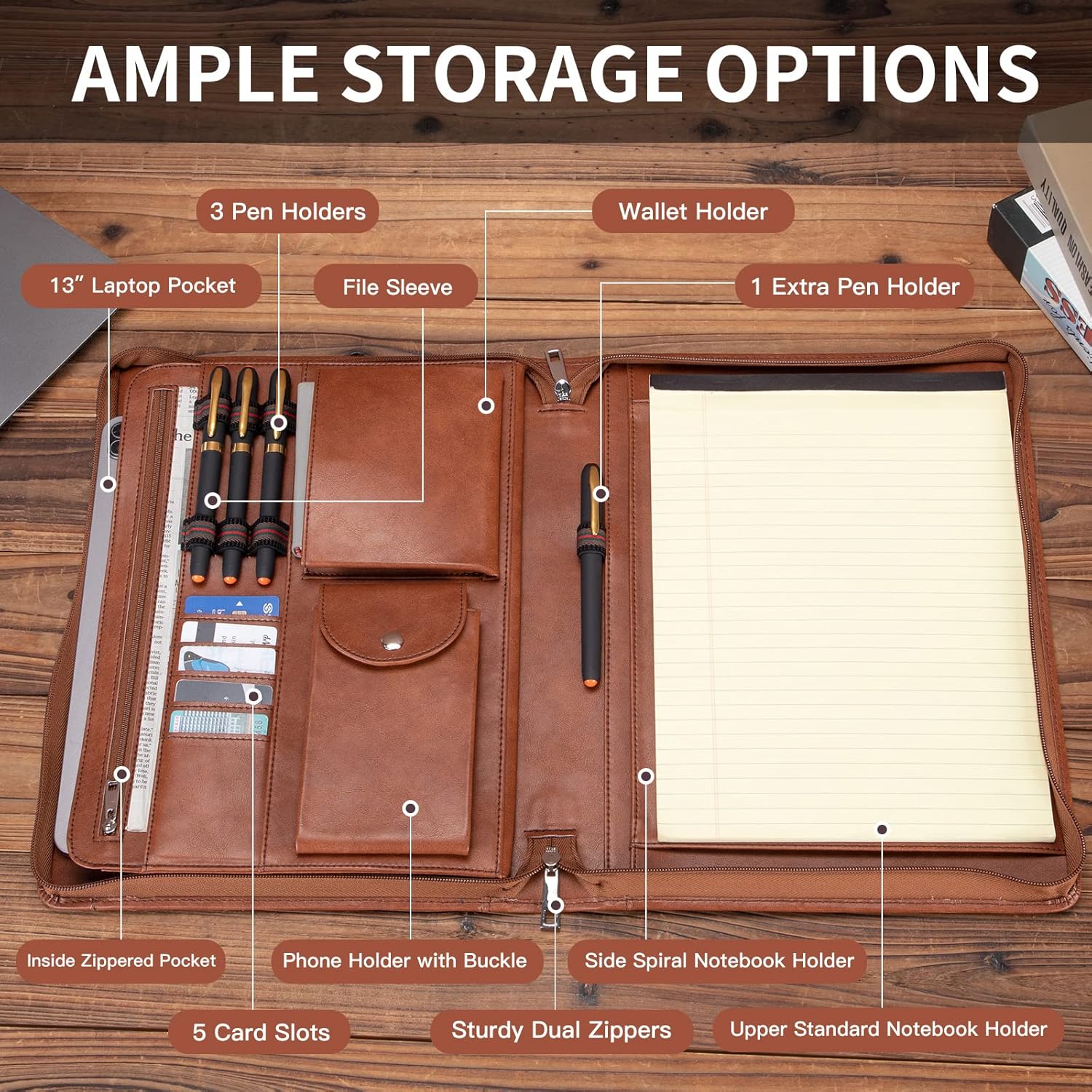 - Functional Storage: Handy exterior pocket for fast filing. Side spiral notebook holder and upper standard notebook holder. Phone holder with buckle, wallet pocket, 4 pen holders, 5 card slots and inside zippered pocket. The inside 13” laptop pocket is large enough for a 13” laptop or 13.3” MacBook Pro (Not for 13.3” MacBook Air).