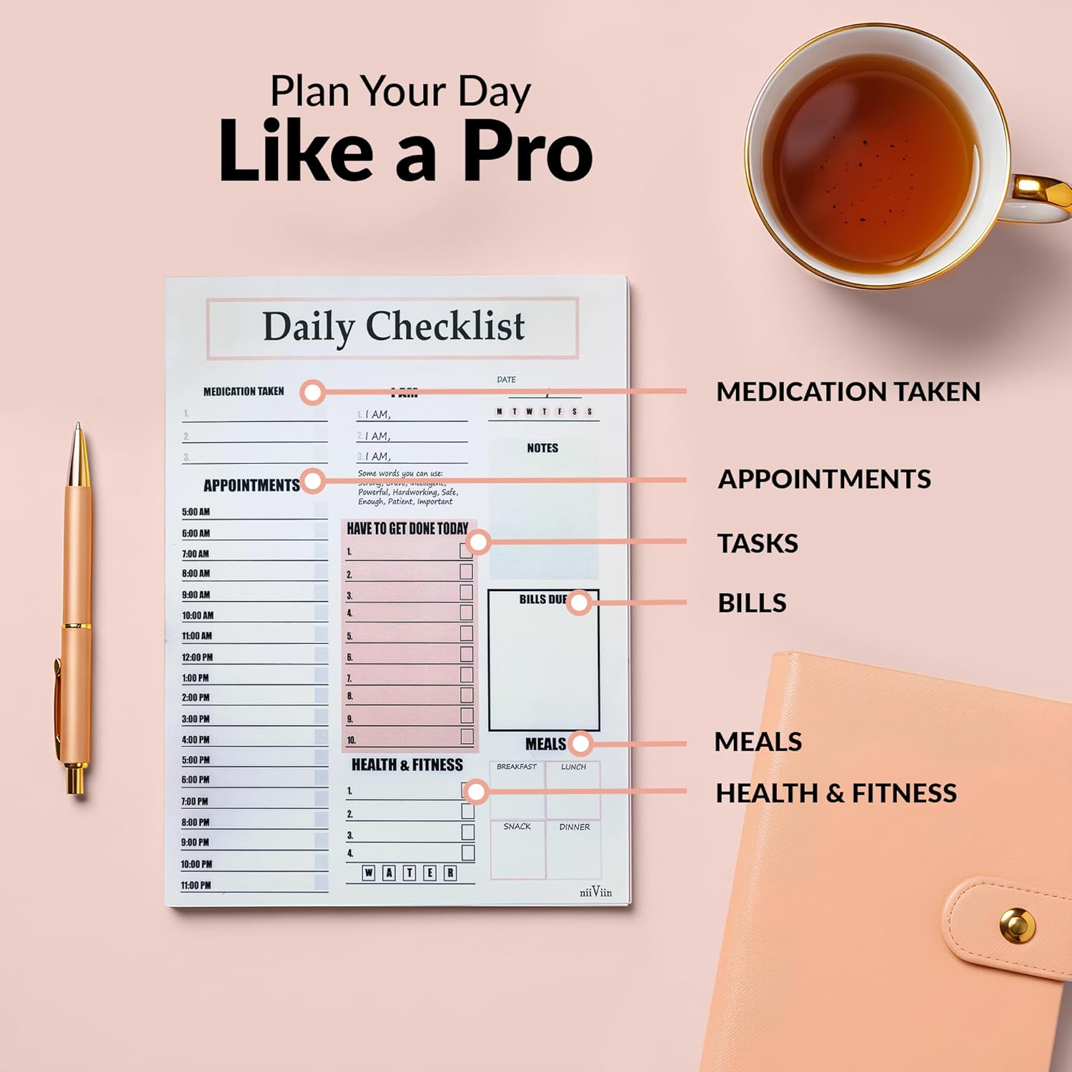 - Crafted with thick 70 lb paper to prevent ink bleed-through and a stiff 50 pt chipboard backing. Works with pens, pencils, and highlighters without smudging. Each undated sheet tears off easily so you can take your daily plan with you, or post it on the fridge with a magnet for quick visibility.
