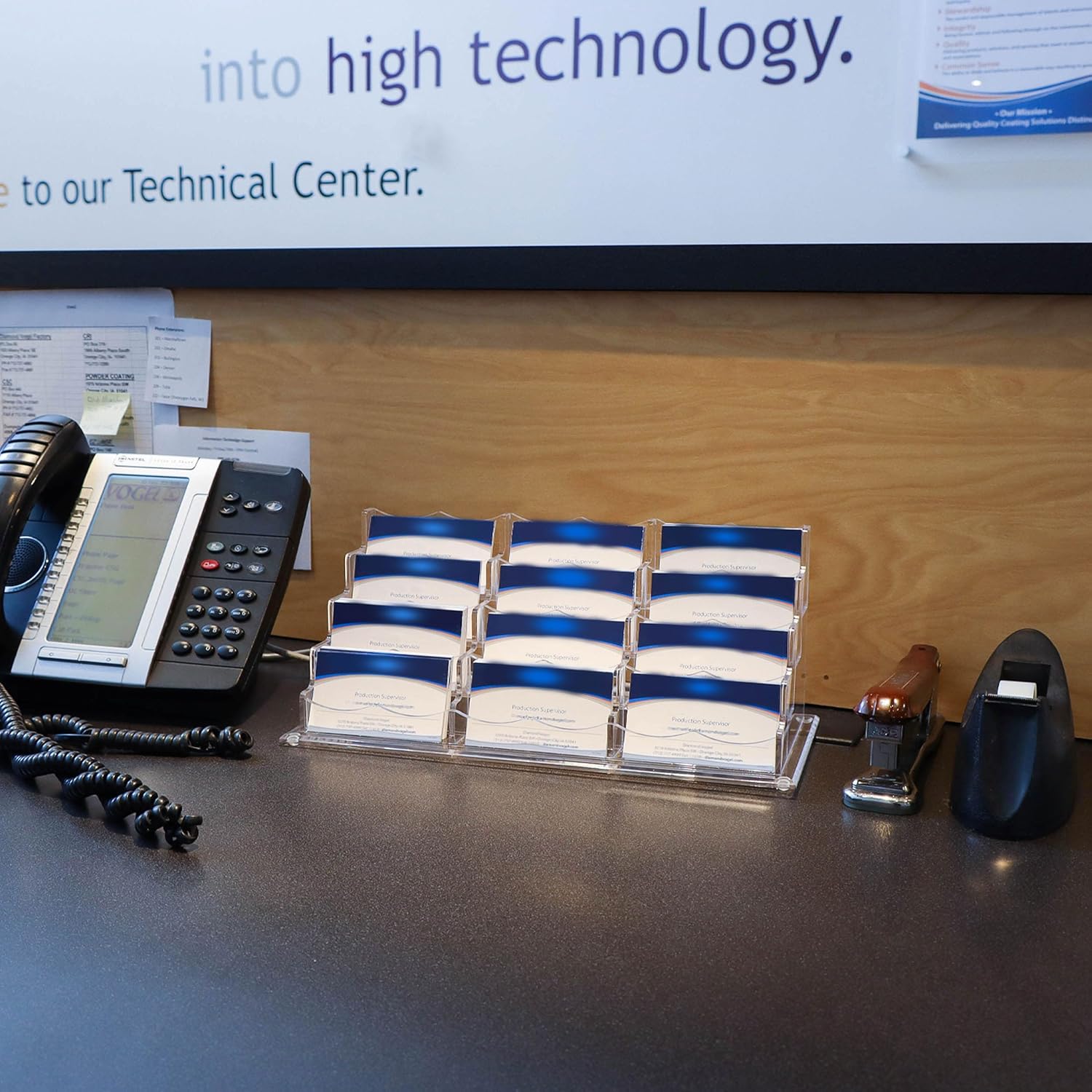 7Penn Acrylic Business Card Holder for Desk - 12 Slot Card Organizer for Desk Storage - Clear Countertop Sticker Display 3 Tier Horizontal Business Card Display Rack - 600 Card Holder Stand