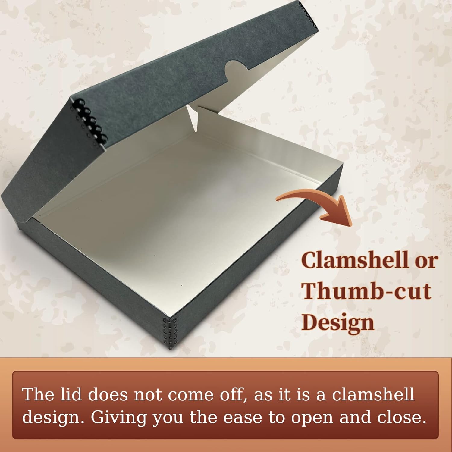 - Design: Clamshell lid with a "thumb-cut", easy to open. Strong metal corners prevent crushing
