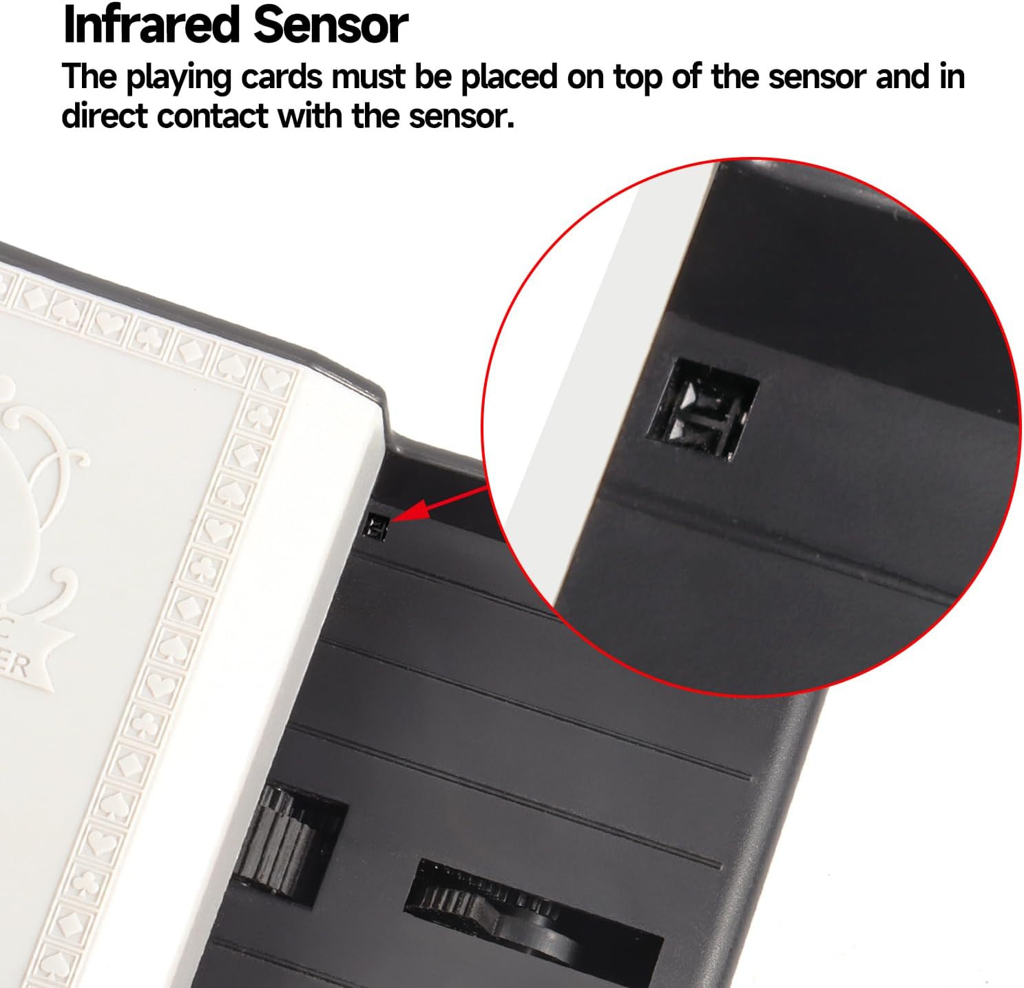 - Professional Card Shuffler: If you've ever bought other card shufflers on the market, you might worry about frequent battery changes; you do not want to press the shuffle switch all the time; you have a better option now; our card shuffler uses a stronger ABS shell, high-performance motor, built-in photoelectric sensor (when the shuffle is over, the machine automatically stops running), switch button with LED light, AC/DC power adapter included (you will save a large pile of batteries)