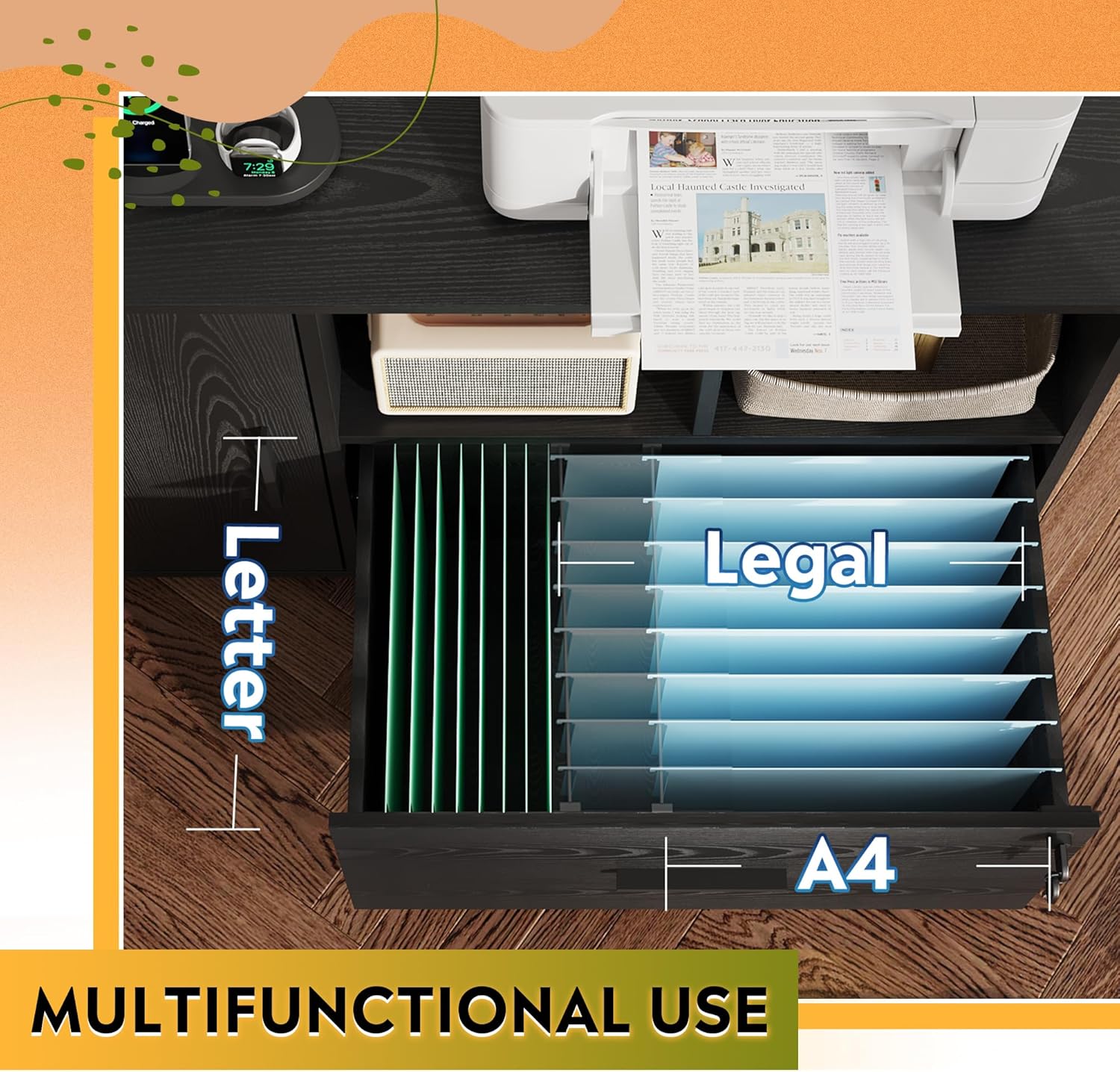- All-purpose storage: The wide filing cabinet with shelf spaces and large storage drawer fulfill different organization needs. The shelves in the side cabinet helps to organize mess in home office, and the spacious top board can store office equipment such as printer and scanner.