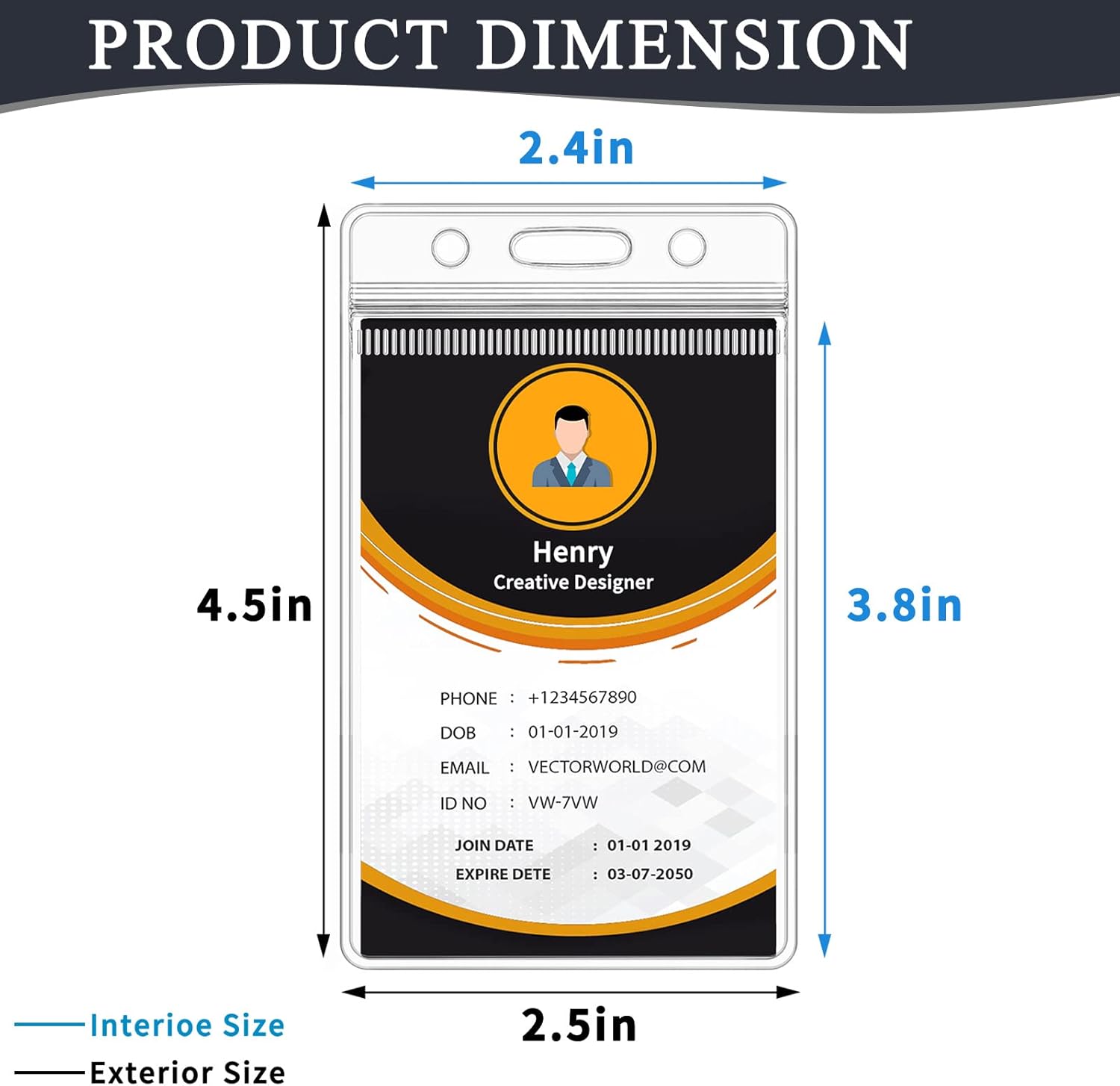 - Waterproof & Dust-proof - Our plastic name tag ID holder is made of quality PVC material, which is durable, not easy to wear, long-lasting, with excellent resealable zipper closure and 2 convex points. Good sealing can effectively prevent water or dust from entering, keeping cards dry and clean. You can safely put your ID card, work card, traffic pass, or credit card in it, and hang other small ornaments to make your name holders more beautiful and stylish.
