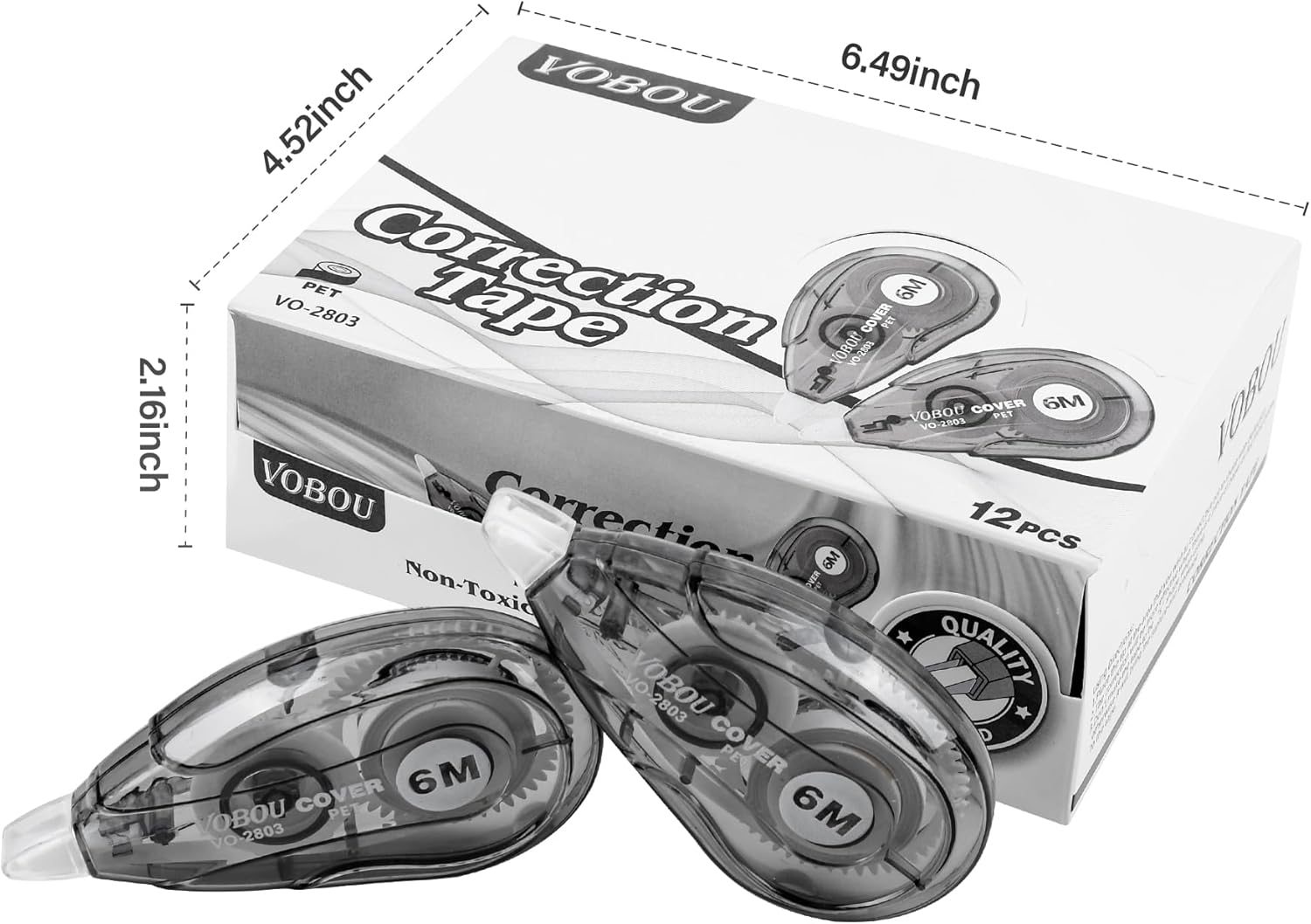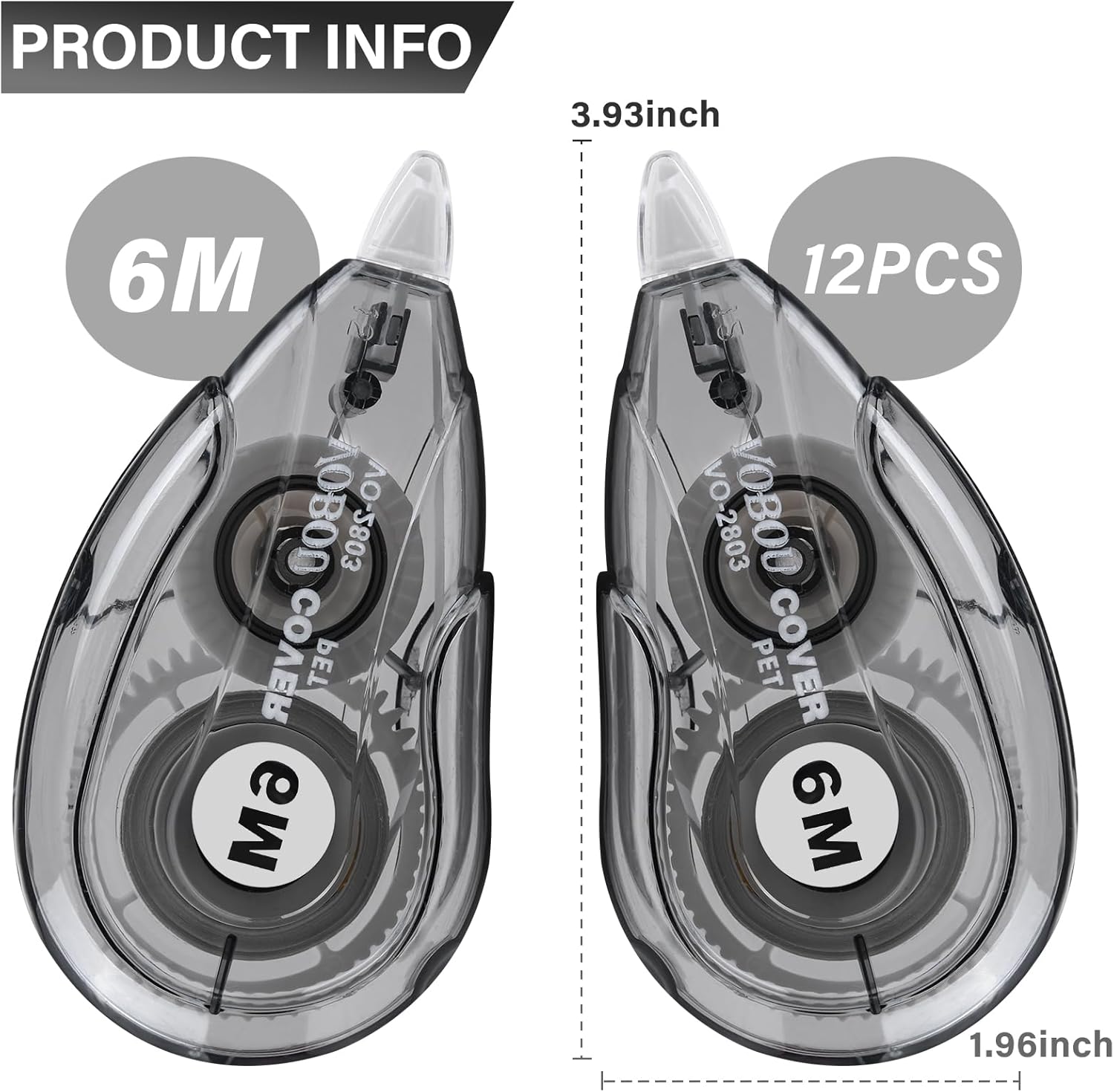 White Correction Tape Dispenser, Easy To Use Applicator for Instant Corrections, For school, Office (Black, 12pack, 6M/256, Tape Width 0.2in)
