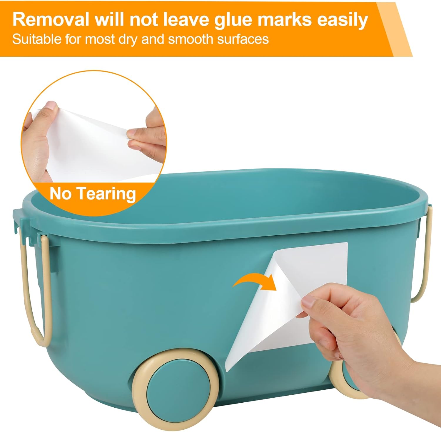 - Strong Adhesive: Our Large Labels For Storage Bins feature a strong, universal permanent adhesive that sticks well to glass, metal, and flat, smooth surfaces. They can be easily removed from these surfaces without leaving residue. However, Removable Labels for Storage Bins are not recommended for rough surfaces, as they can leave sticky marks.