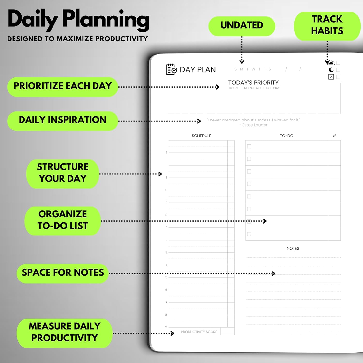 - START ANYTIME & STAY CONSISTENT – With 27 weeks of undated daily planning pages, plus weekly and monthly review sections. You can begin anytime, improve your time management and build a consistent planning habit on your own terms.