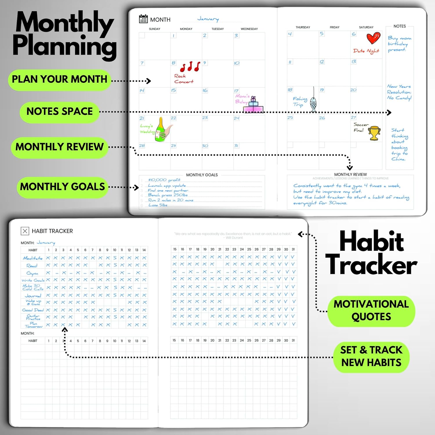 - STAY ALIGNED WITH YOUR GOALS – Use built-in goal-setting tools and review prompts to stay focused on long-term success—whether you’re managing business milestones, career growth, or personal development.