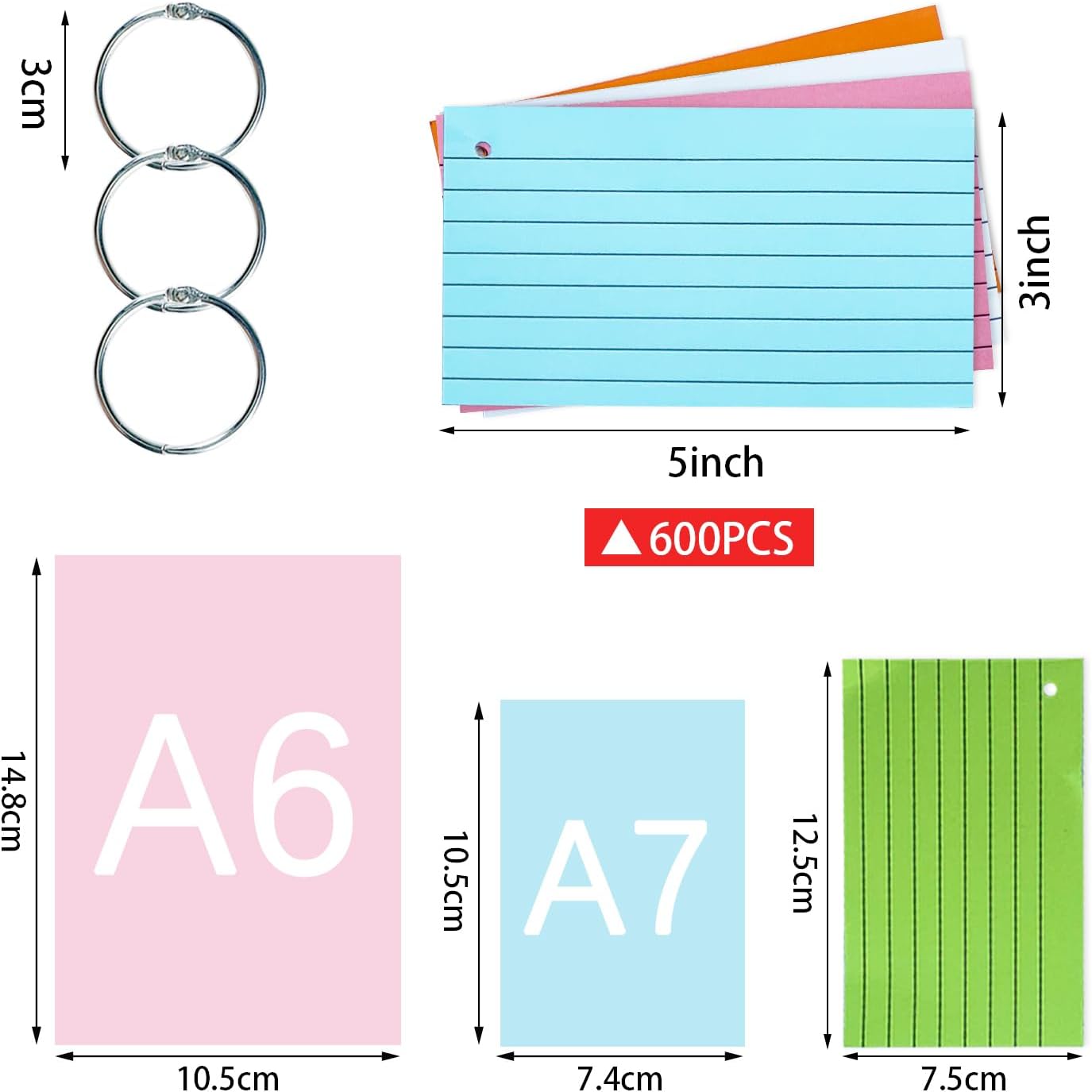 - PACKAGE: 600 PCS Flash Cards Paper with 8 Rings, including 8 different colors. Each index card measures 3 x 5 inches, made of thin cardstock and writed on using pens and pencils to study, memorize words, take notes, etc.