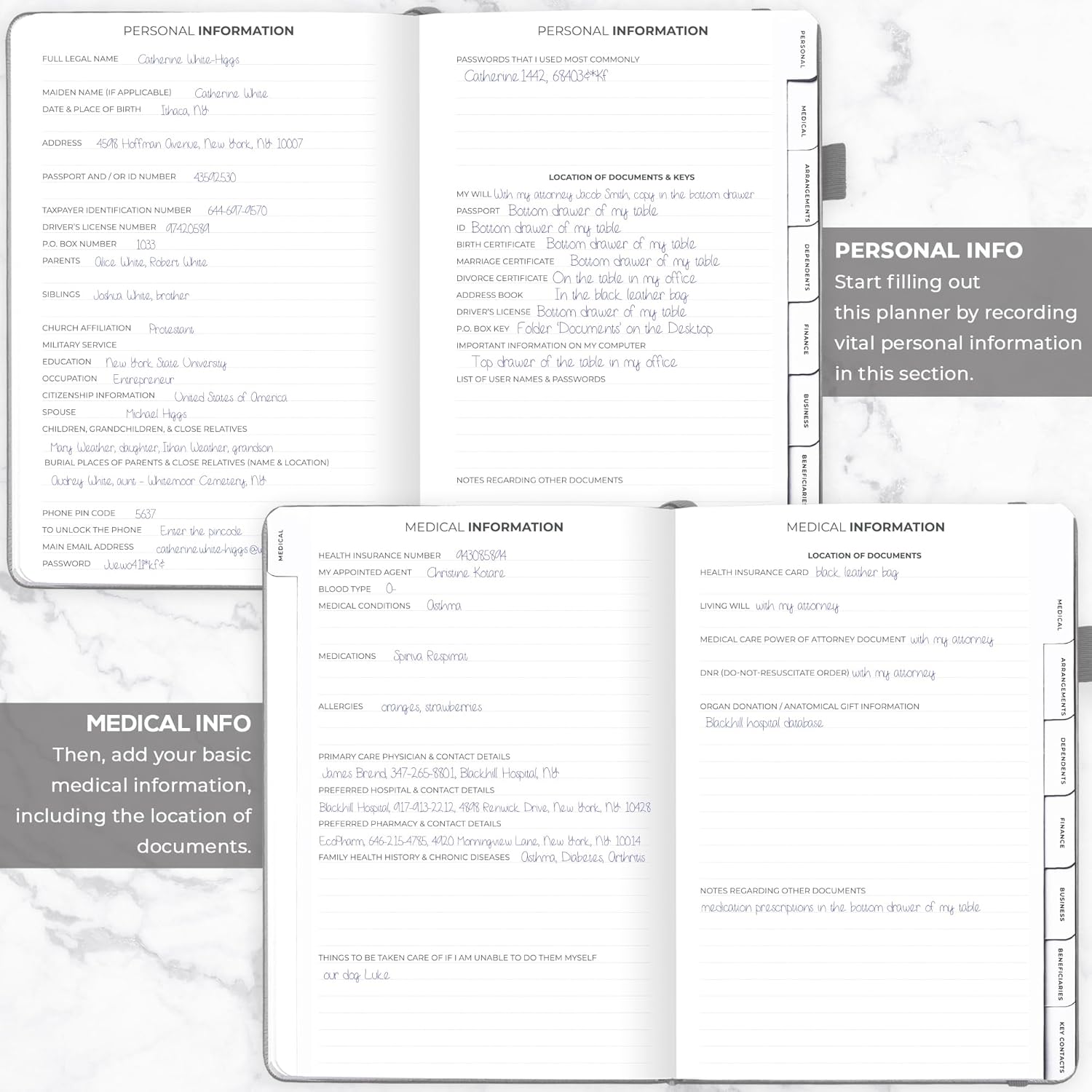 - MEDICAL & FINANCIAL INFO, INSURANCE POLICIES, ACTIVE MEMBERSHIPS & MORE: Inside this funeral planning workbook, you can add care instructions for dependents and pets, personal property, finance & business info, insurance policies, beneficiaries, and more.