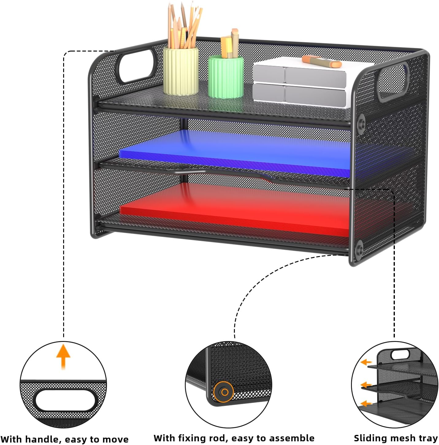 - NEW Updated Handle Design: The desk organizer comes with handles, makes it easier to move.Also the paper tray comes with 2 metal bars to reinforce, which makes it more sturdy and much easier to assemble.