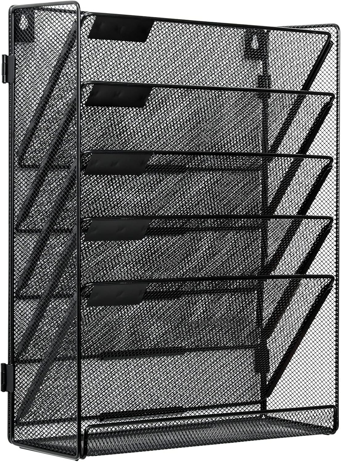- Large Capacity: This wall mounted file organizer with 5 vertical arranged pockets for filing folders, magazines,mail, bills and 1 flat tray for desk accessories. Also has label slots to attach labels for easy identification of the contents in each compartment.